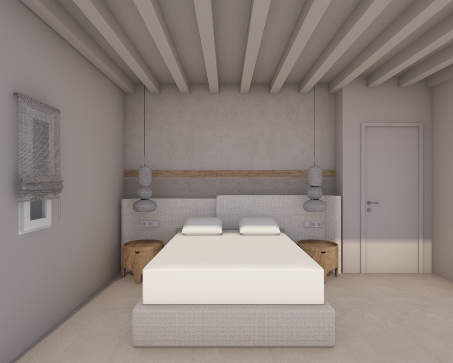 create a high end photorealistic render of a bright luxurious bedroom with a refined and expensive feel the materials should feel authentic with realistic texture the flooring is matte with a polished cement look in a sand off white shade cohesive and elegant the lighting should be warm natural and balanced maintaining a bright atmosphere while preserving soft shadows and depth dd beautifully arranged high quality bed linens with soft folds and a premium hotel aesthetic the overall mood should feel contemporary sophisticated bright and editorial as if photographed for a luxury interior design magazine pendant lights beside the bed has fabric like surface has fine pleats forming two overlapping layers that create a dynamic textured look travertino behind the bed