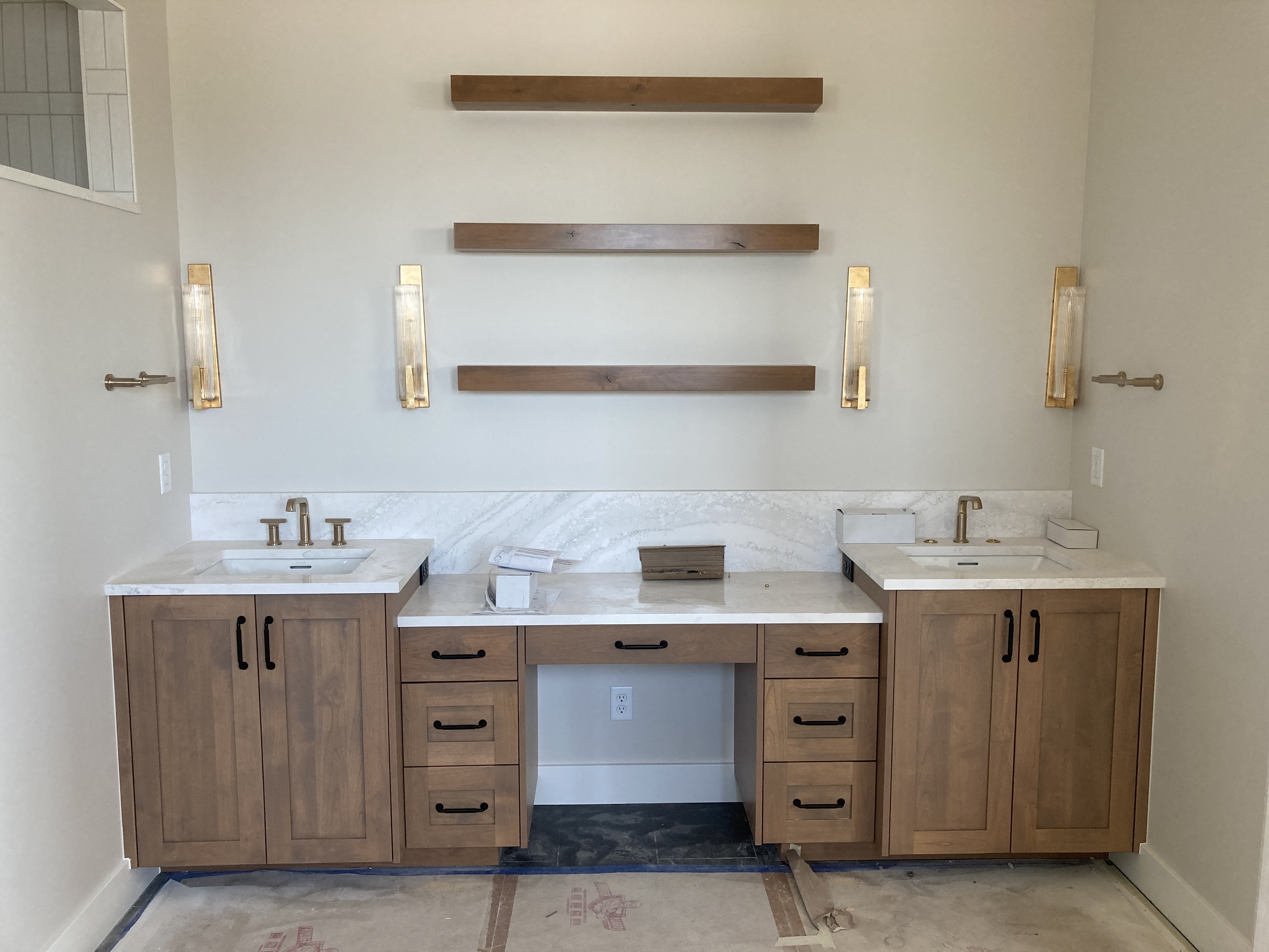add tile to the entire floor get rid of everything on the countertop add mirrors above the sinks between the lights add towels hanging on the towel rods on the wall stage the shelves for a bathroom make the lights on the wall light up