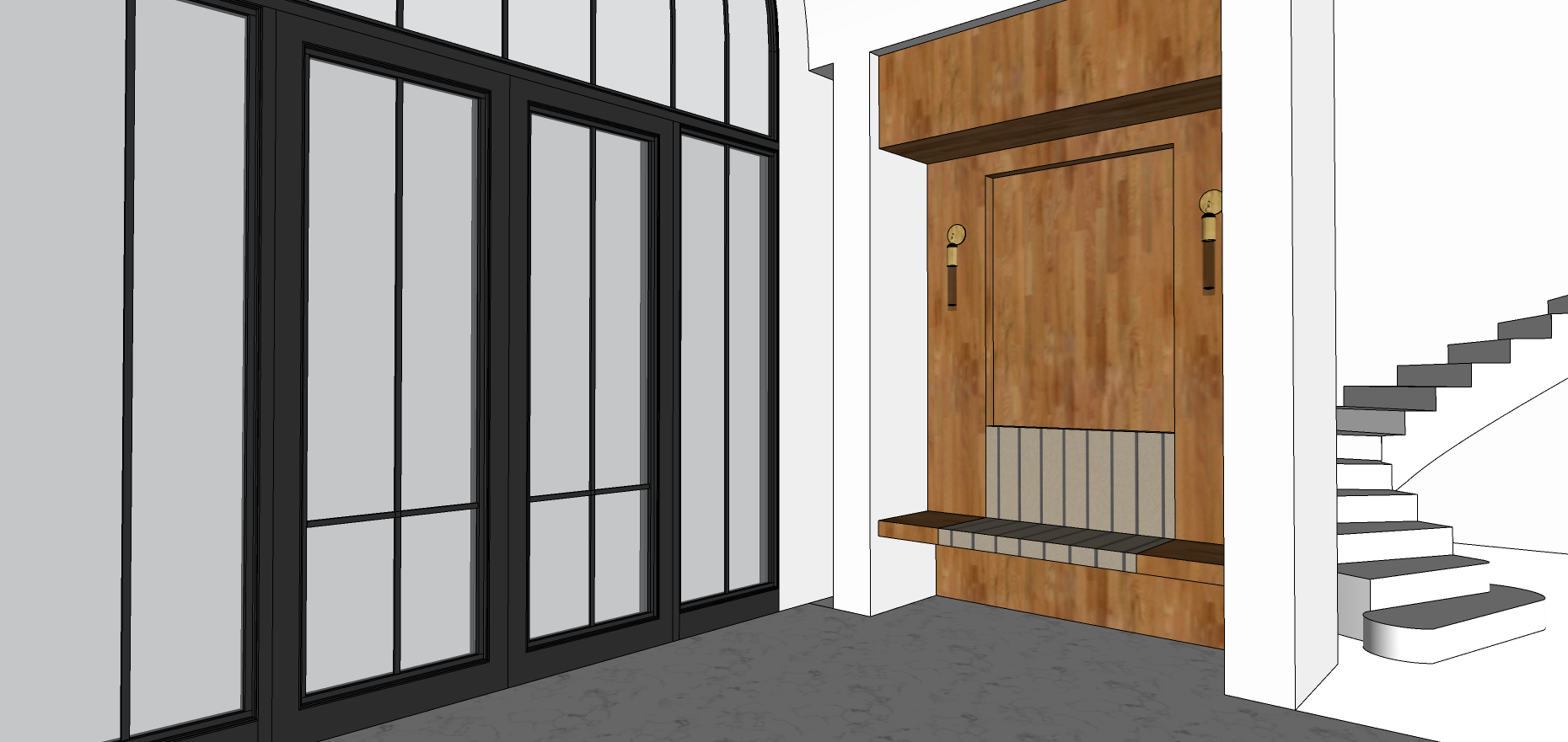 add driveway and landscape outside and make bench cushion leather