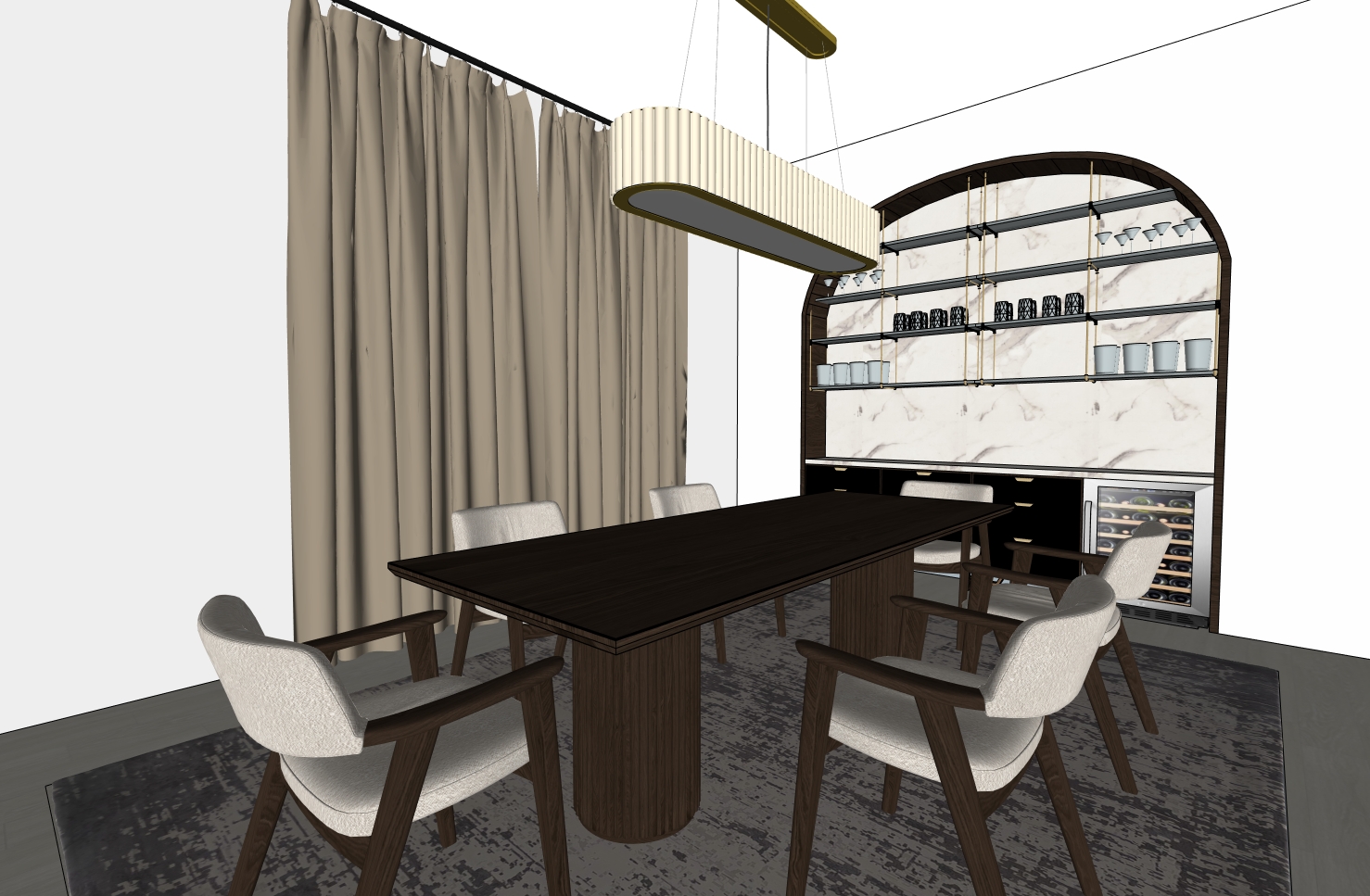 ultra realistic modern luxury kitchen soft contemporary aesthetic with warm organic tones large waterfall island clad in full height white marble with soft grey veining seamless mitered edges subtle polished finish three upholstered counter stools in cream boucle fabric with black metal frames back wall wrapped in large format marble slab backsplash extending to ceiling matte black and dark walnut cabinetry combination with integrated brass hardware fluted walnut cabinet panels for texture contrast built in professional stainless steel range with brass accents double wall ovens integrated panel ready refrigerator with long brushed brass handles three oversized dome pendant lights in warm aged brass finish suspended above island with soft diffused glow floating walnut shelves black framed window above sink allowing natural daylight subtle under cabinet lighting for ambient warmth wide plank light oak flooring in neutral grey tone lighting soft natural daylight entering from window and side openings balanced warm interior lighting realistic shadow depth global illumination ray traced reflections soft ambient bounce light from marble surfaces material realism priority highly detailed marble veining with subtle translucency accurate brass metal reflections slightly brushed not mirror polished rich walnut grain variation matte black cabinetry low sheen boucle upholstery tactile and textured camera eye level perspective 28 35mm lens slight depth of field architectural photography composition balanced exposure ultra high resolution 8k photoreal render mood refined modern luxury calm and elevated warm minimalism high end residential interior editorial interior photography style
