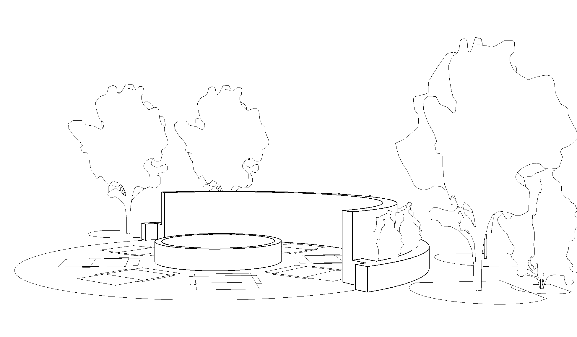 this is a fireplace with stucco circular surround with trees around the outside there is a small low planter around the edge with small shrubs add fire to center of firepit use stone pavers for the flooring and grass around