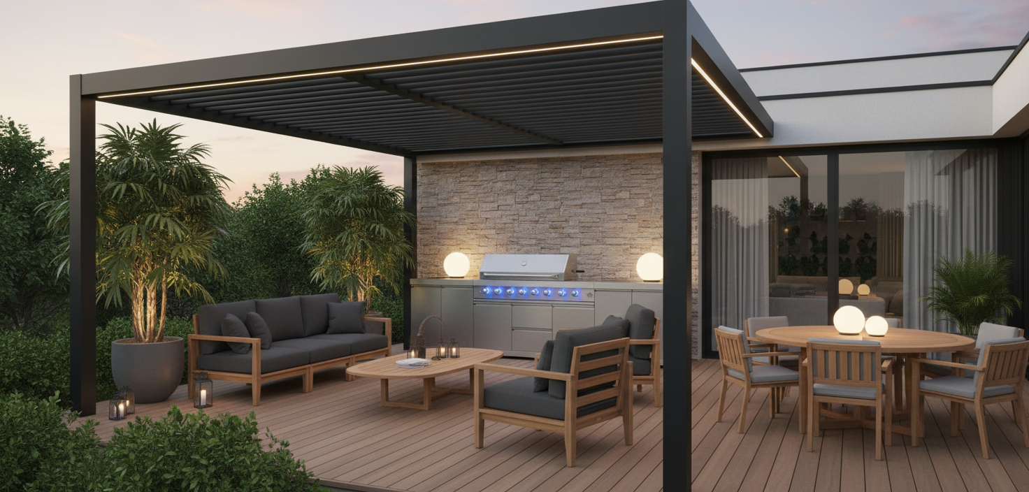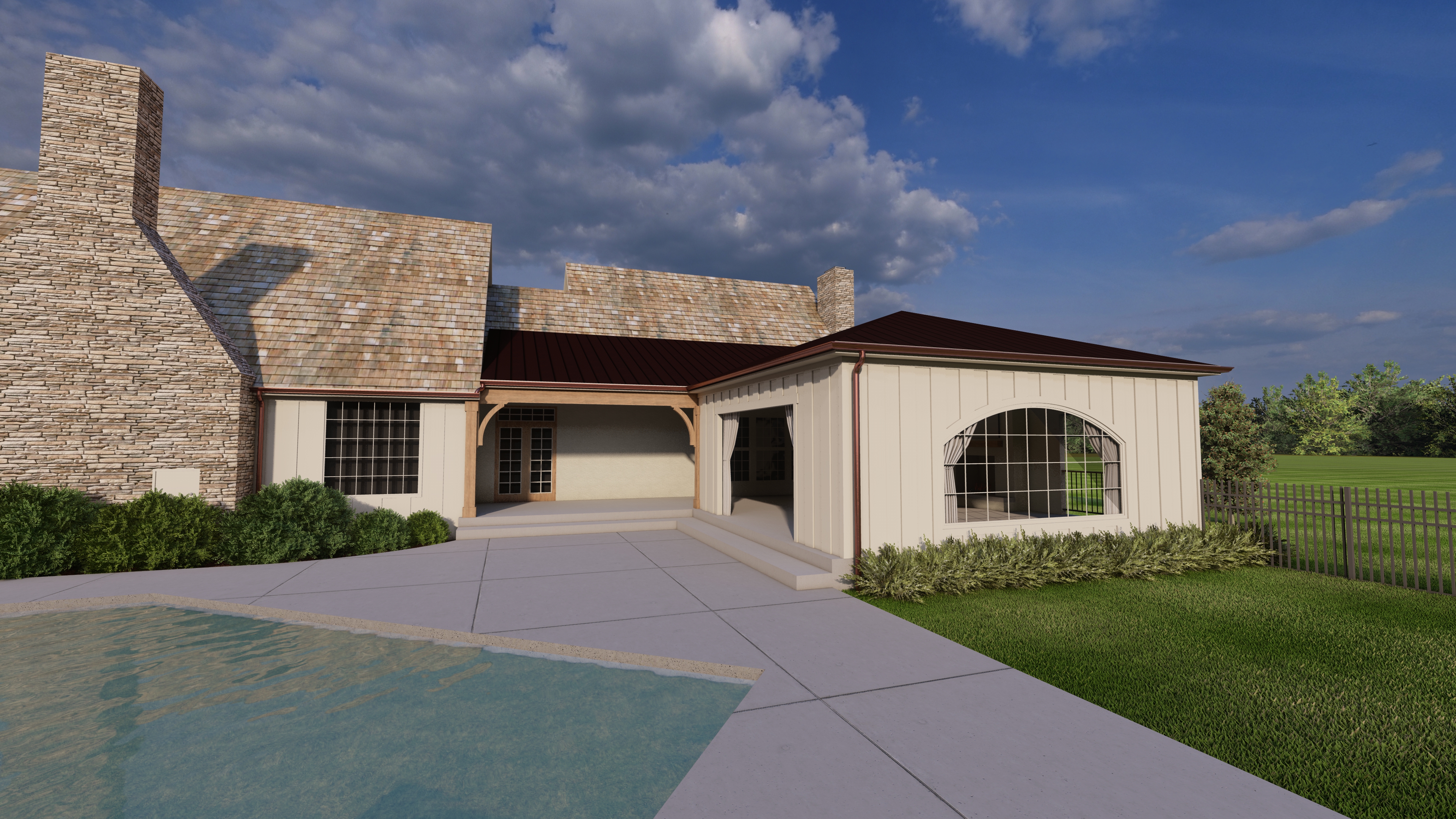 realistic render cloudy sky simple shrubs manicured lawn wooded background