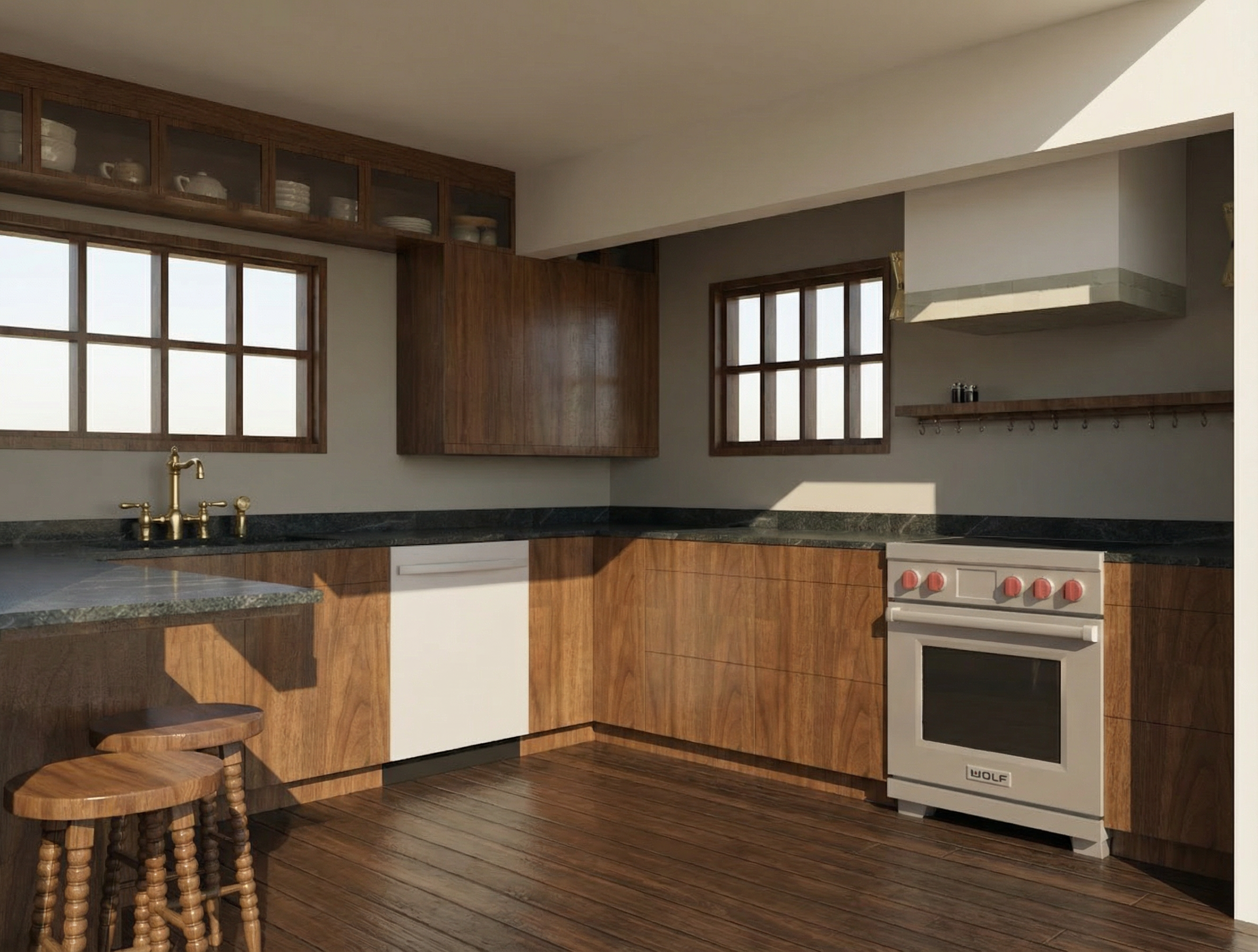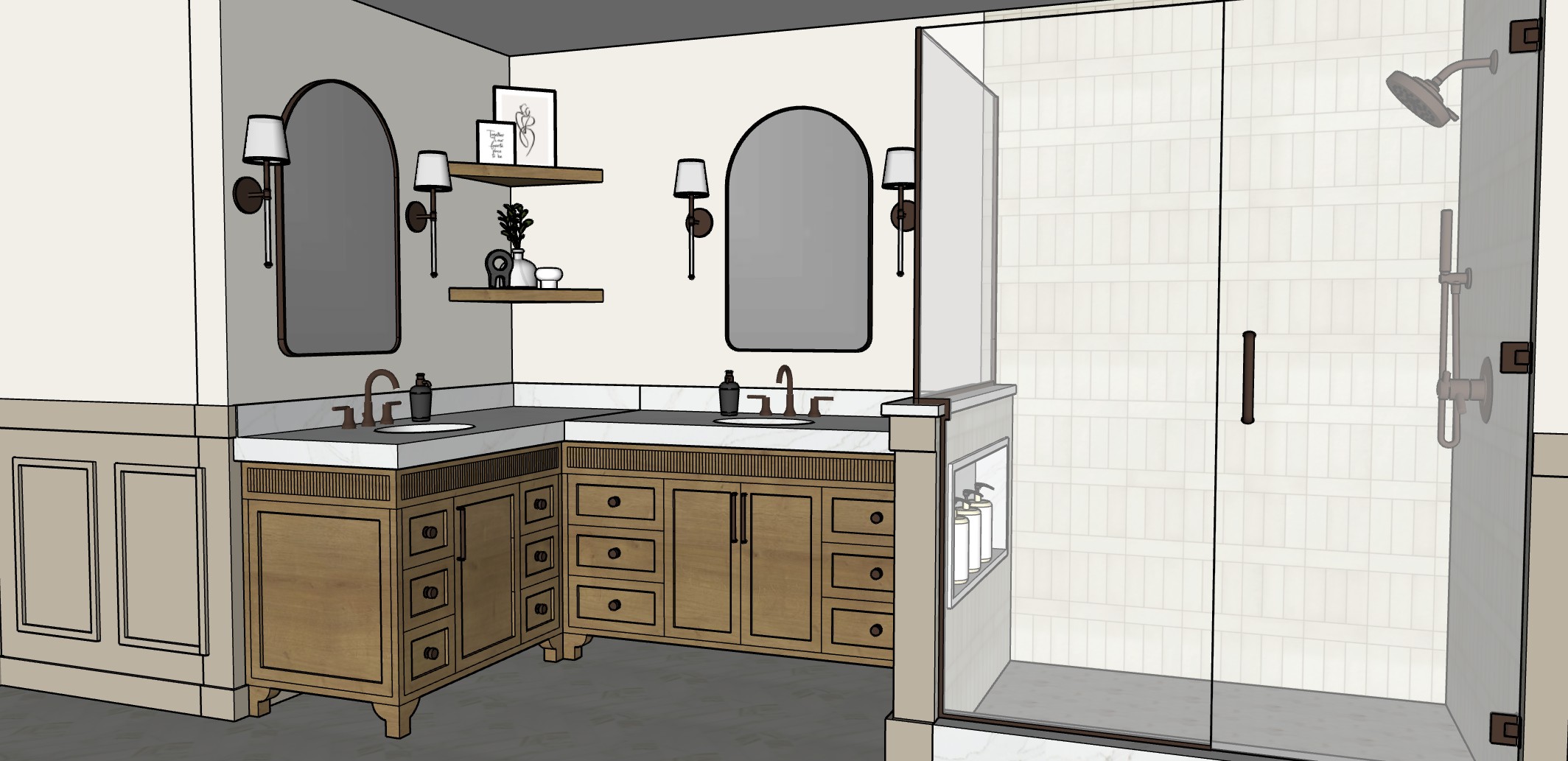 make this photorealistic the floor is by tilebar calacatta oro white 3x12 polished laid in a herringbone pattern the vanity is a corner vanity white oak 3 countertop called calacatta izaro with soft grey and brown veining an led light strip underneath the vanity and a reeded detail at the top plumbing and hardware are champagne bronze finish the sconces have a white shade gold details and acrylic details the shower tile is tile bar montuck gin the molding casings and doors are benjamin moore pashmina the walls above are benjamin moore alabaster use natural lighting and soft shadows