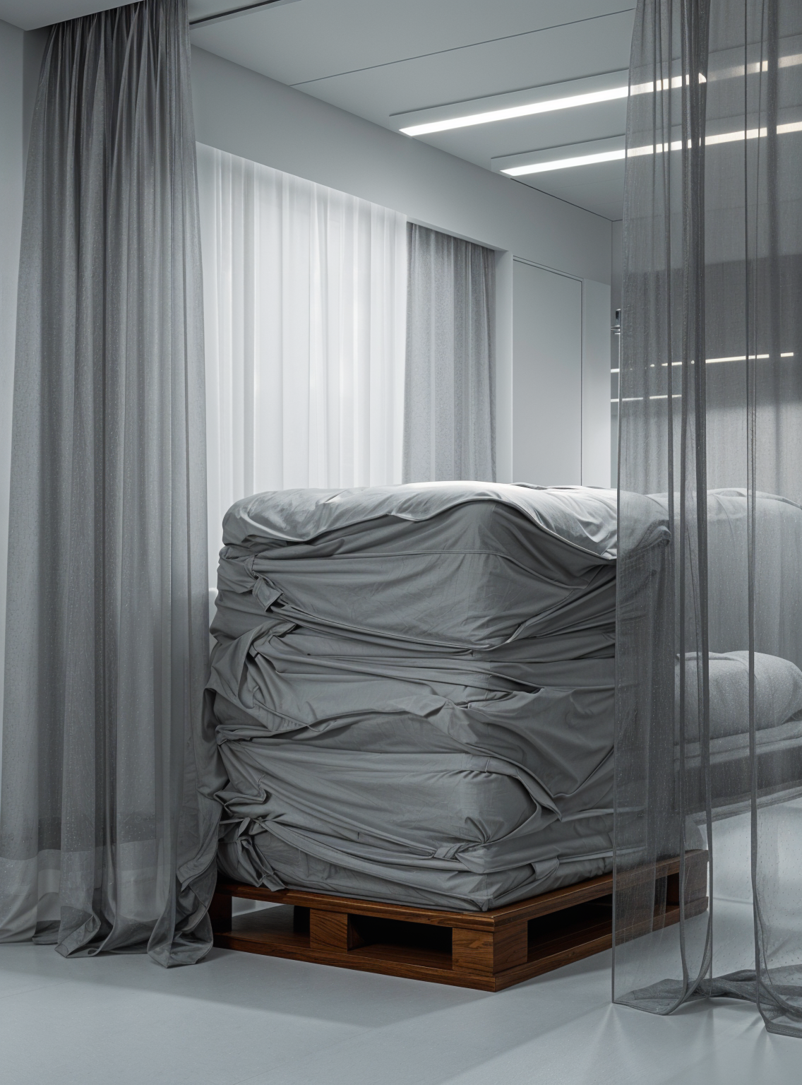 a cold refigerator camera interior filled with fruits bags envolve in plastic on wooden pallets transparent opaque white plastic curtains hang partially around the pallets providing a contrast with their slightly matte texture the floor is a clean smooth light blue adding a fresh modern feel