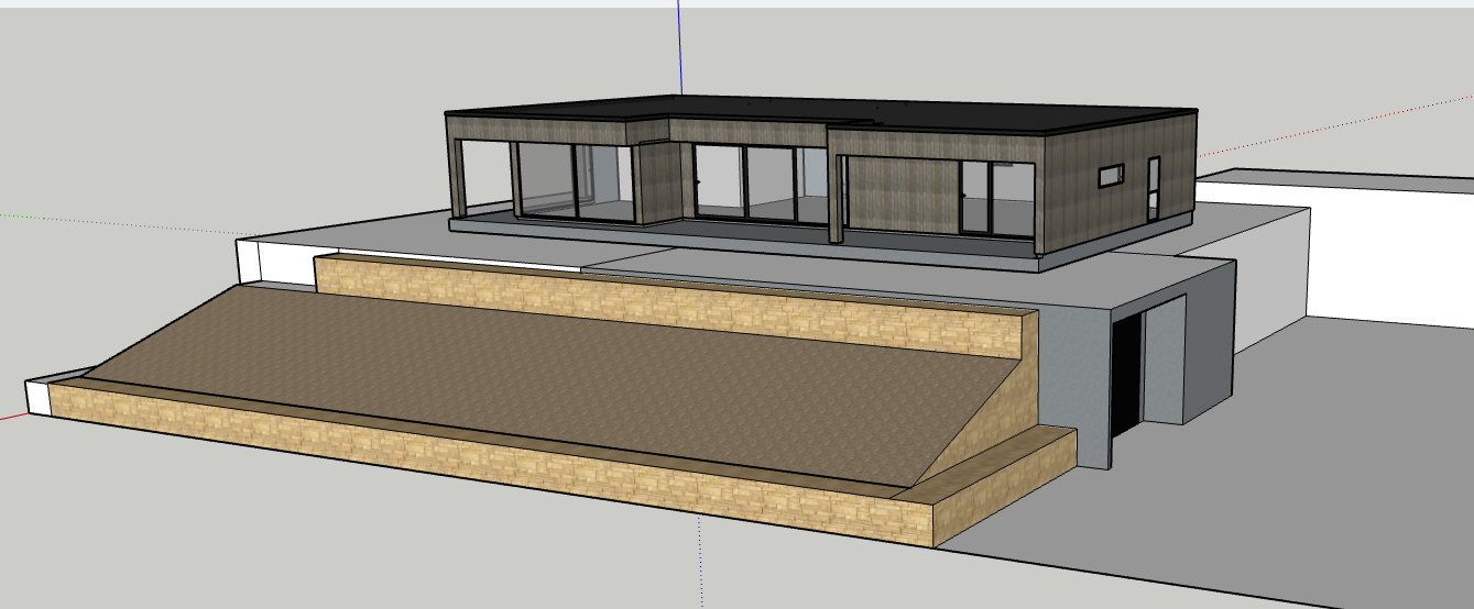 render a modern architectural house with a sleek minimalist design the upper structure should feature dark wood siding in rich espresso tones with expansive glass windows around it reflecting a serene twilight sky the base of the structure should consist of smooth light gray concrete walls a retaining wall made of textured warm beige stone adds contrast the ground should be rendered in a warm taupe concrete with a subtle texture overall create a calm sophisticated atmosphere with ambient evening light casting gentle shadows