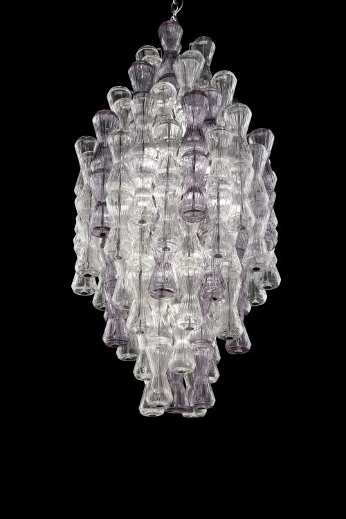 a chandelier made of glass featuring soft pastel colors like light pink baby blue and mint green the chandelier has an intricate layered design with a delicate and elegant appearance set against a dark background to emphasize the pastel hues