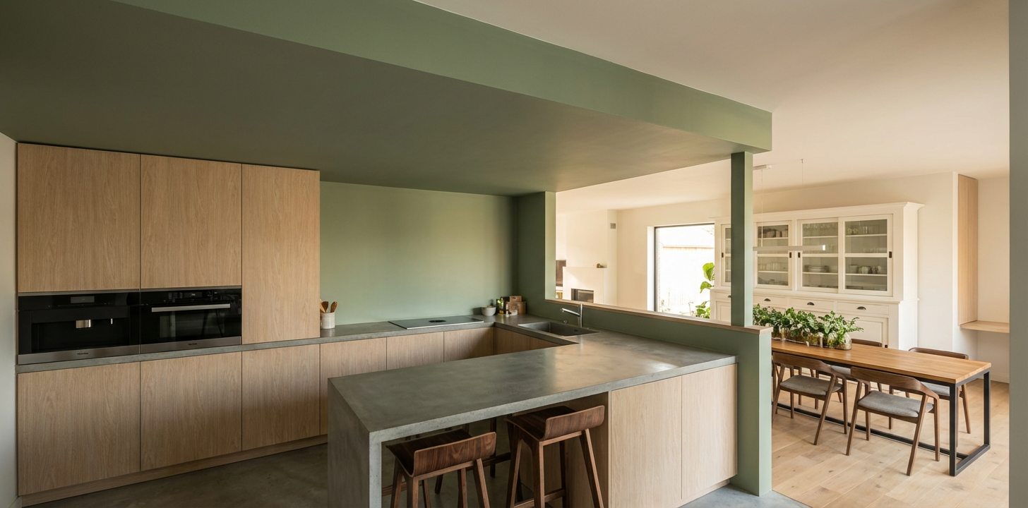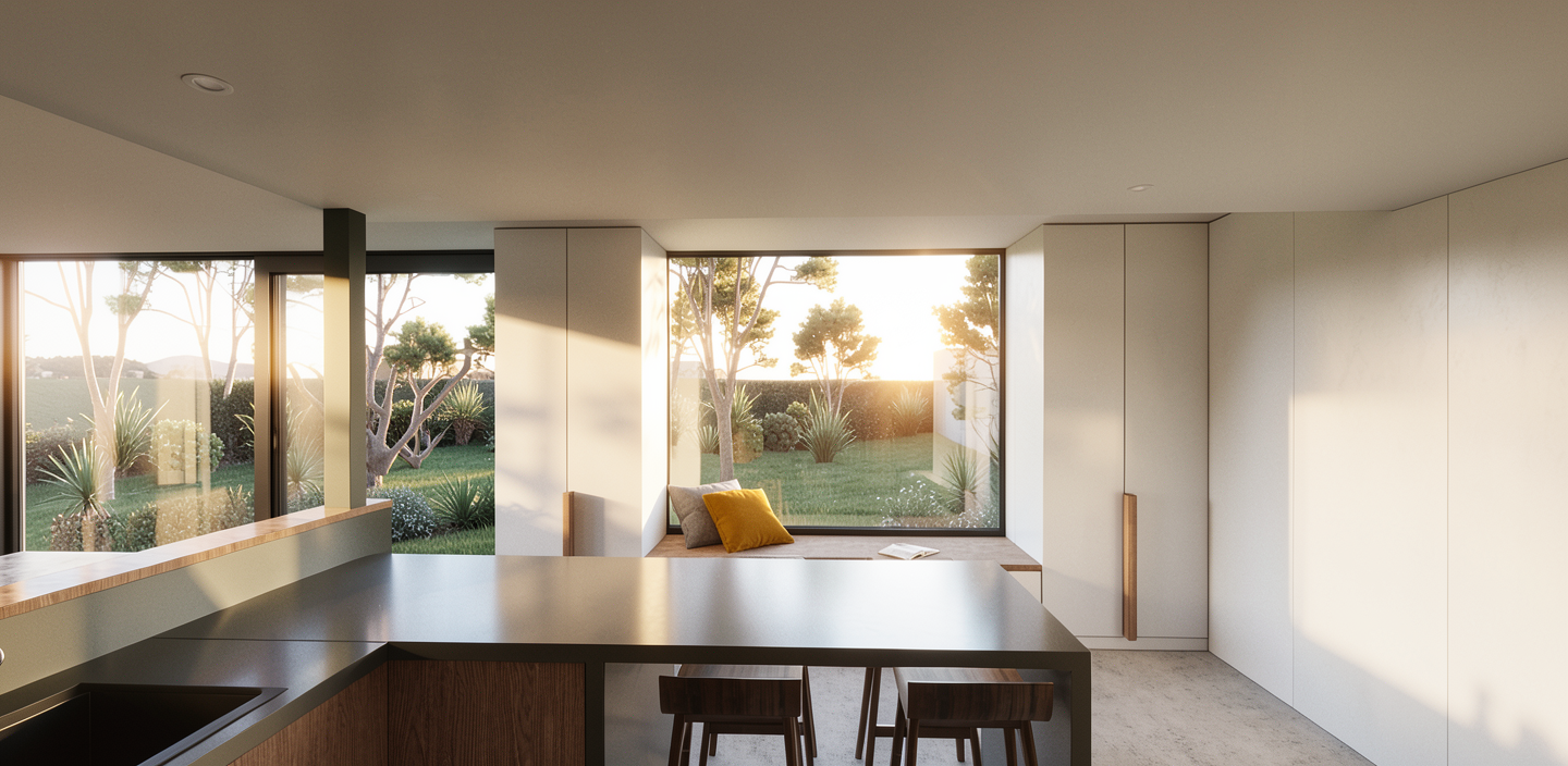 in this hall change the back wall for a black aluminum glass wall spanning the width and height divided into four sections apply clay plaster to the walls and ceiling and apply the bologna microcement of solo gietvloeren on the floor replace the visible windows with black aluminium windows featuring muntin divisions