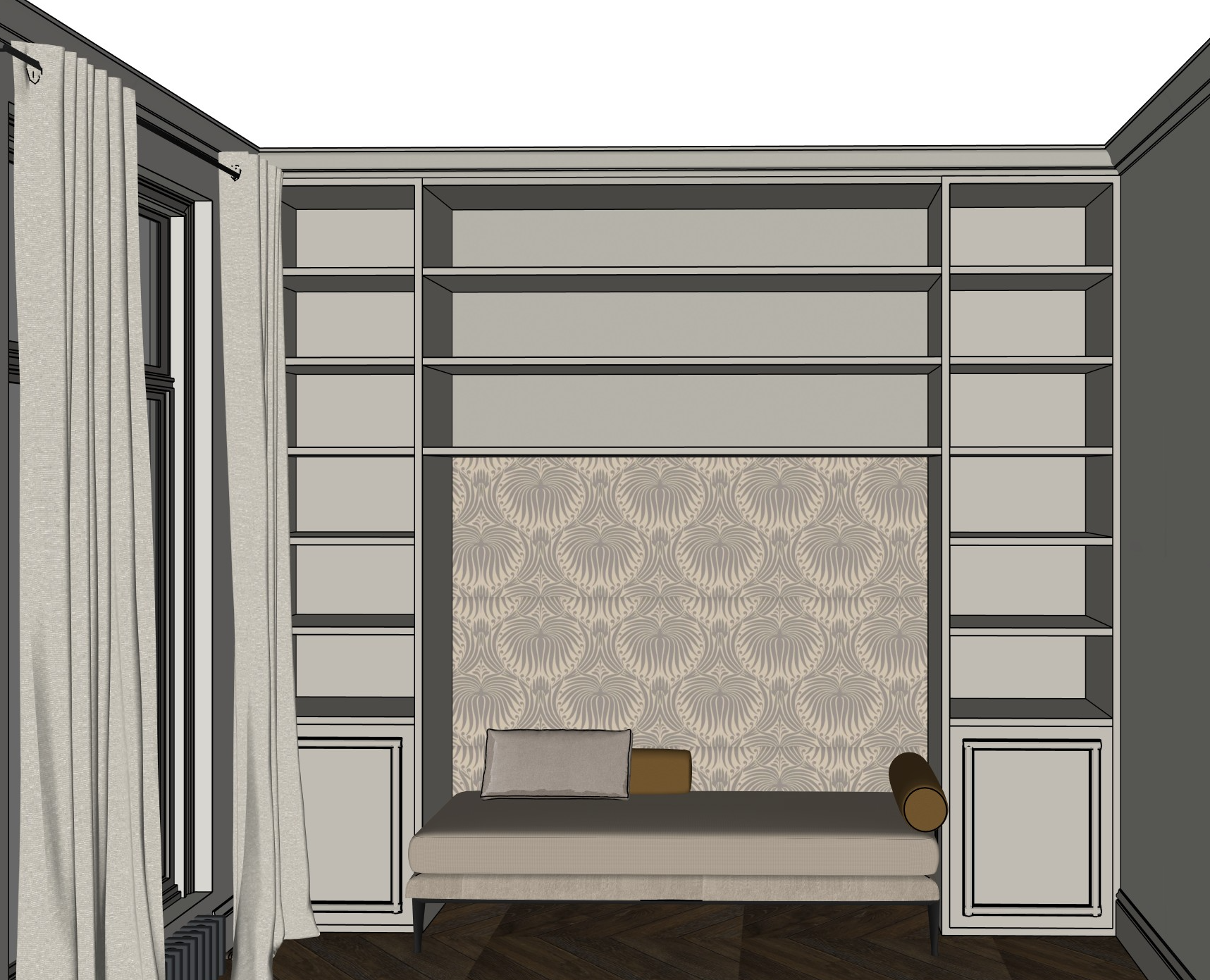 the wall the shelves and millwork is in farrow and ball purbeck stone https www farrow ball com fr peinture purbeck stone the wallpaper is this farrow and ball lotus wallpaper https www farrow ball com fr papier peint lotus sku 5029496661118 the mouldings on the doors should be more rounded the mouldings on the doors of the library are these ones https www oracdecor com fr fr cimaises p8020 model length axis 5743 variations 5848
