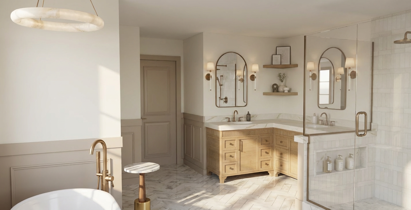 please make this photorealistic the flooring is a 3 x12 polished marble inspired tile laid in a herringbone pattern the chandelier is alabaster and the fixtures are all a champagne bronze do not show any towel bars on the walls the shower tile is a soft white the countertops are a white quartz with soft and subtle beige veining the doors and casing are the same color as the lower half of the molding which is pashmina by benjamin moore above the molding is alabaster by benjamin moore add soft natural lighting and shadows the vanity is white oak with a reeded fluted detail at the top the countertop is 3 thick the sconces have an acrylic detail