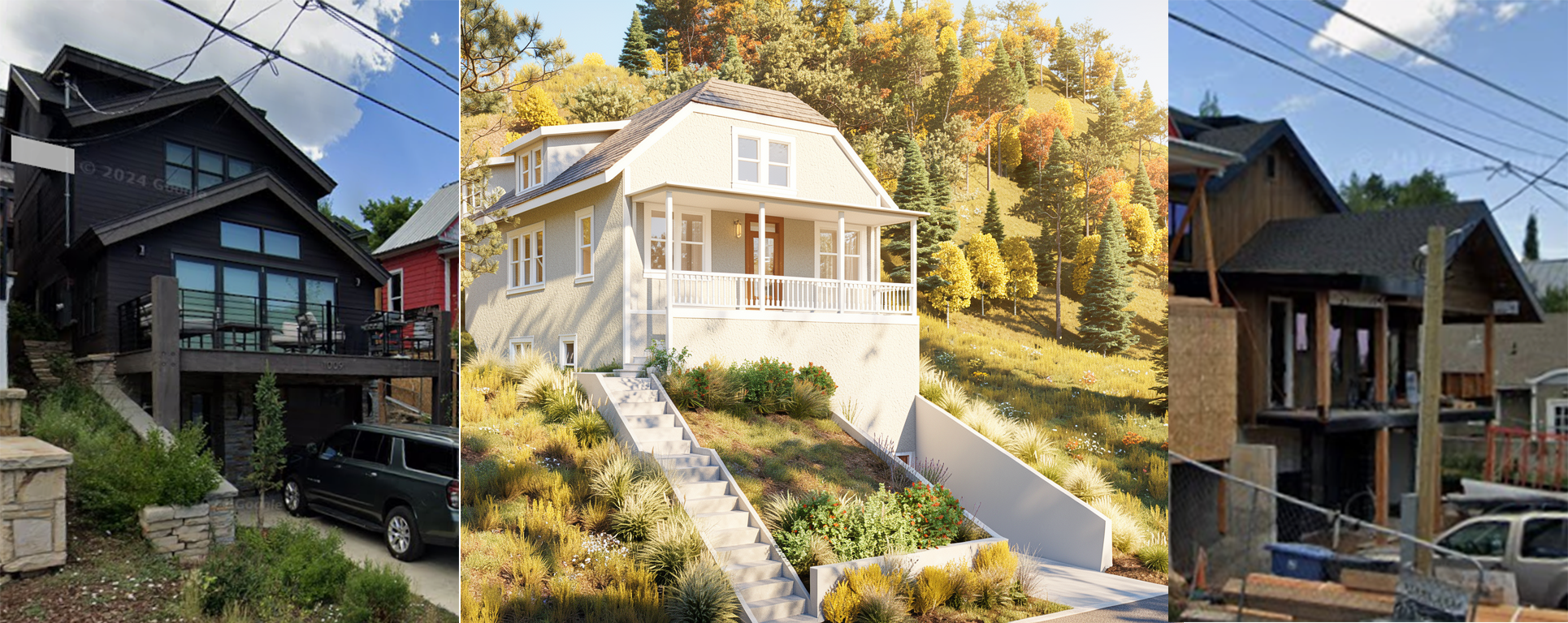 blend these three house to look like one digital architectural rendering which style matches the style of the image house in the middle whole background to match the one of the middle sections remove fence on he right image change red house on the left image to blend with the middle house and match its finishes