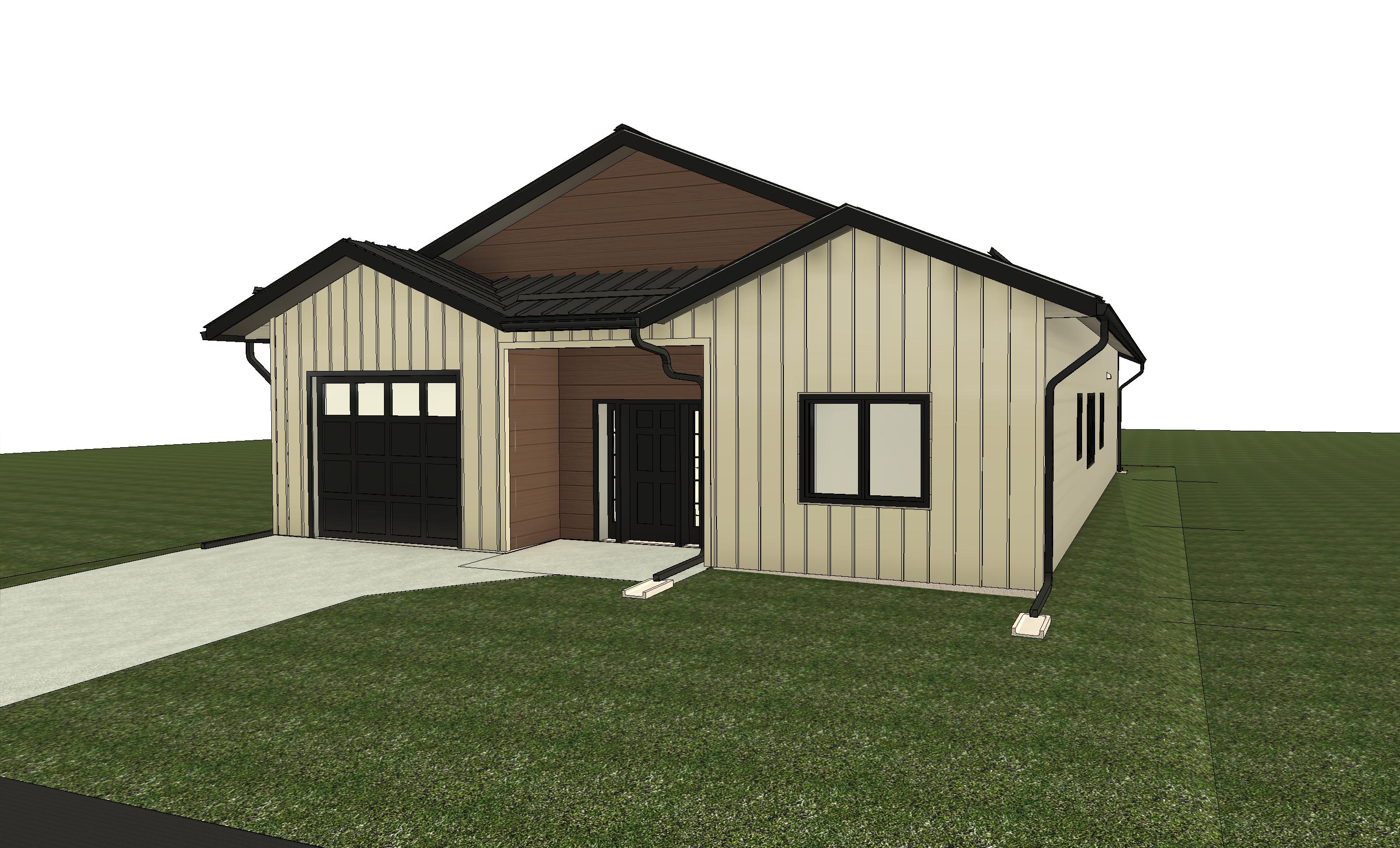 a modern single story house with a gabled roof and beige vertical siding the roof and window frames are deep black adding contrast the garage door and main door match in black while the porch area is accented with warm brown tones the surrounding grassy lawn is lush green complementing the natural setting render with soft diffused daylight for a serene afternoon atmosphere