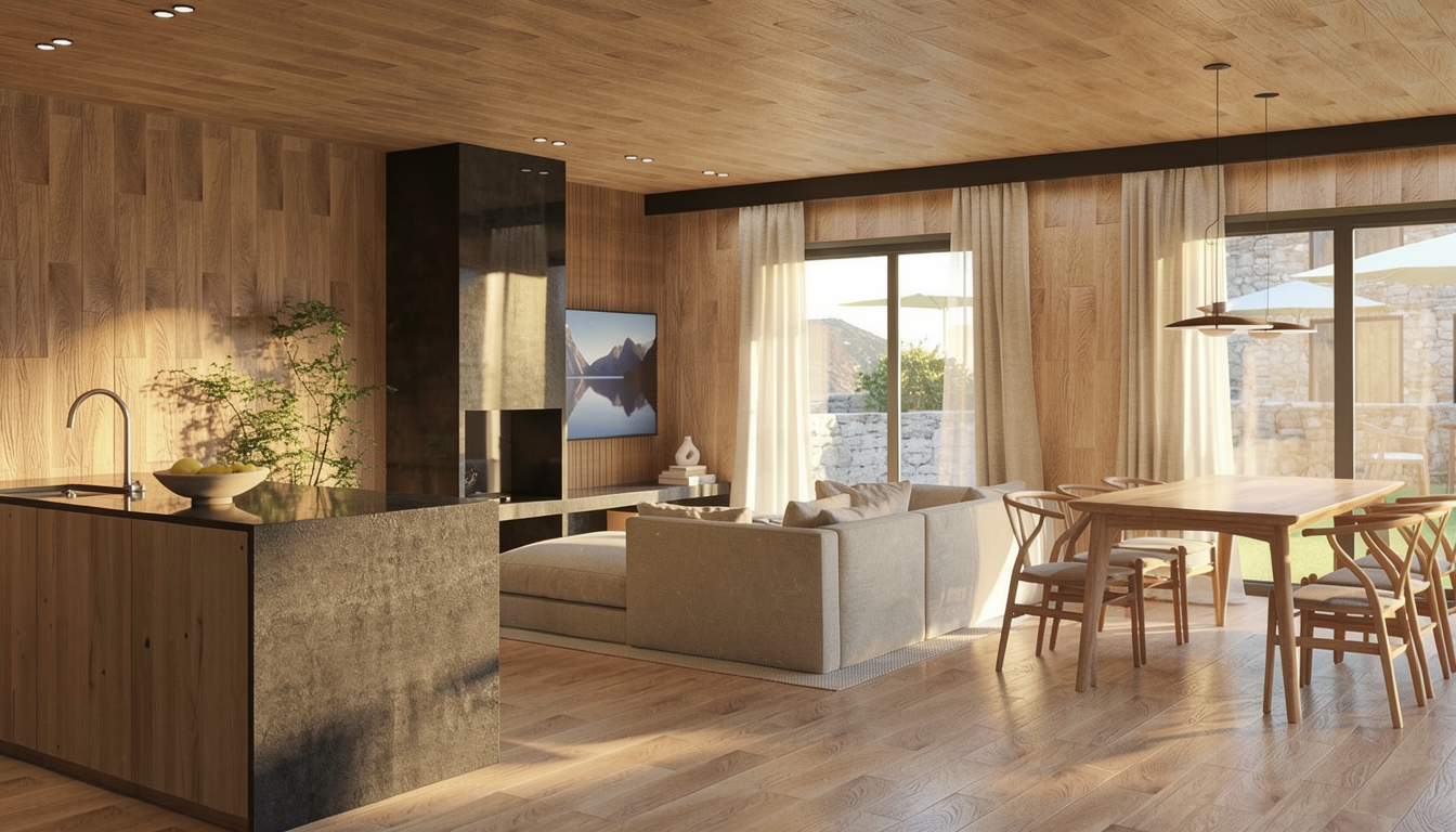 use this exact photo without change except make the green door a little less bright change the stone shown on the door to glass and provide a stone paver in gravel walkway from the viewer to the patio of the building on the left side