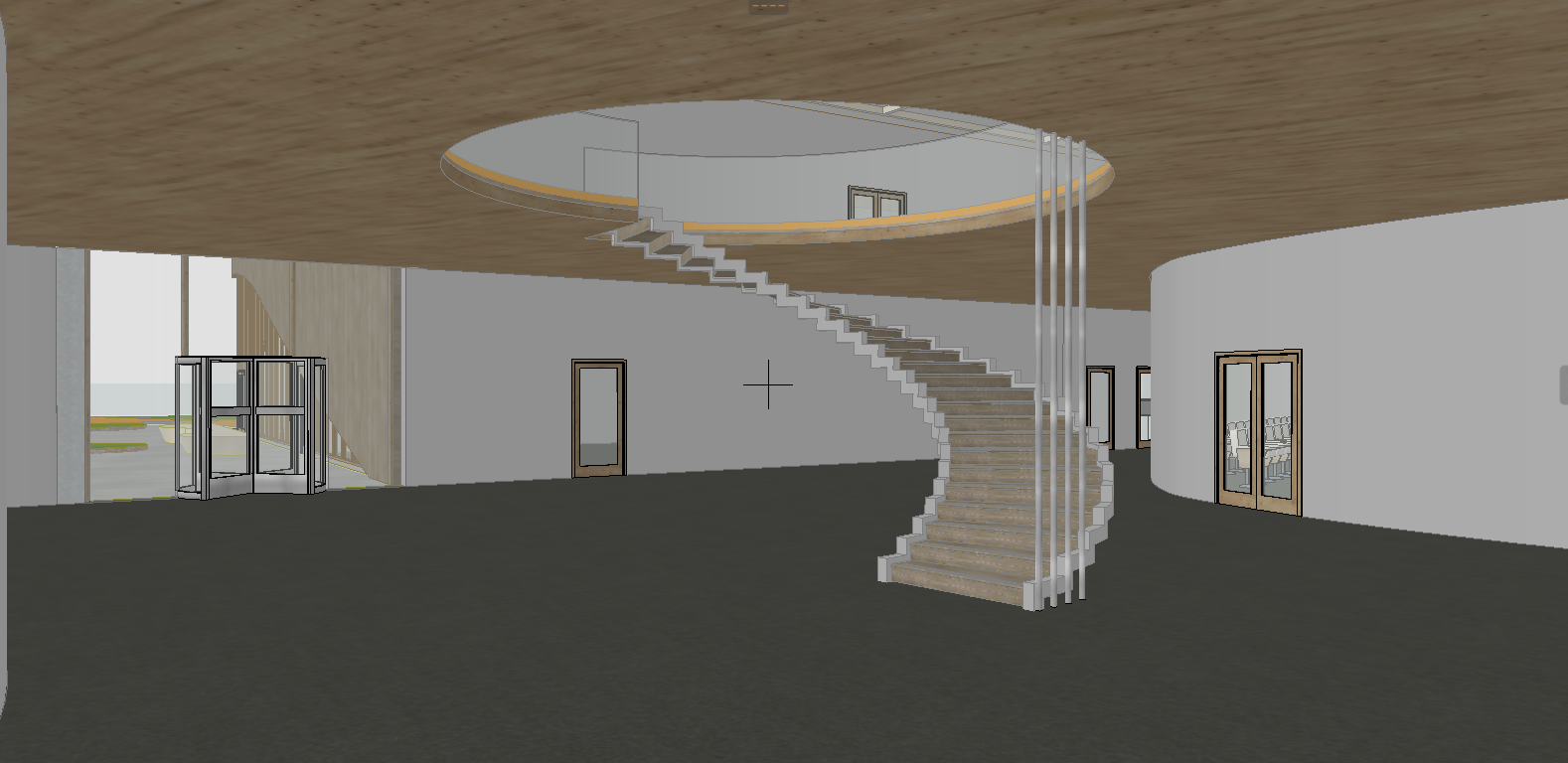 create a foyer for an art school that is modern and inviting the railing on the staircase should be from floor to ceiling there should be art on the walls modular furniture for recreation and reading nooks add lighting and a realistic setting not too many objects an art installation should hang from the eye of the staircase