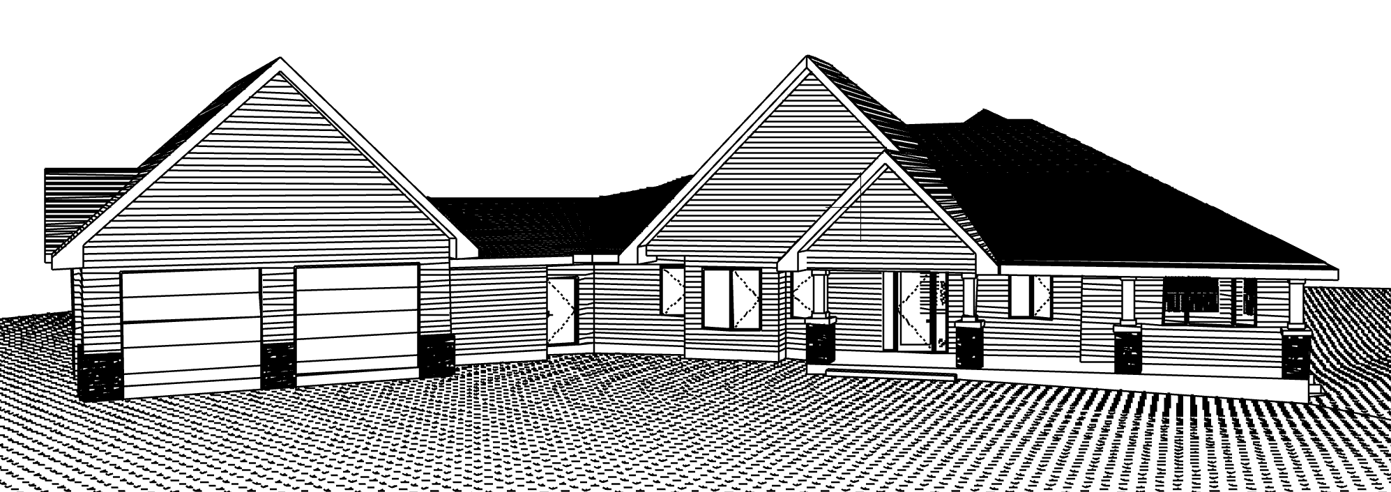 exterior shot modern farmhouse style with canexel walnut siding vertical board and batten siding in gables stone base trim in gables curved concrete driveway boreal forest in background architecture