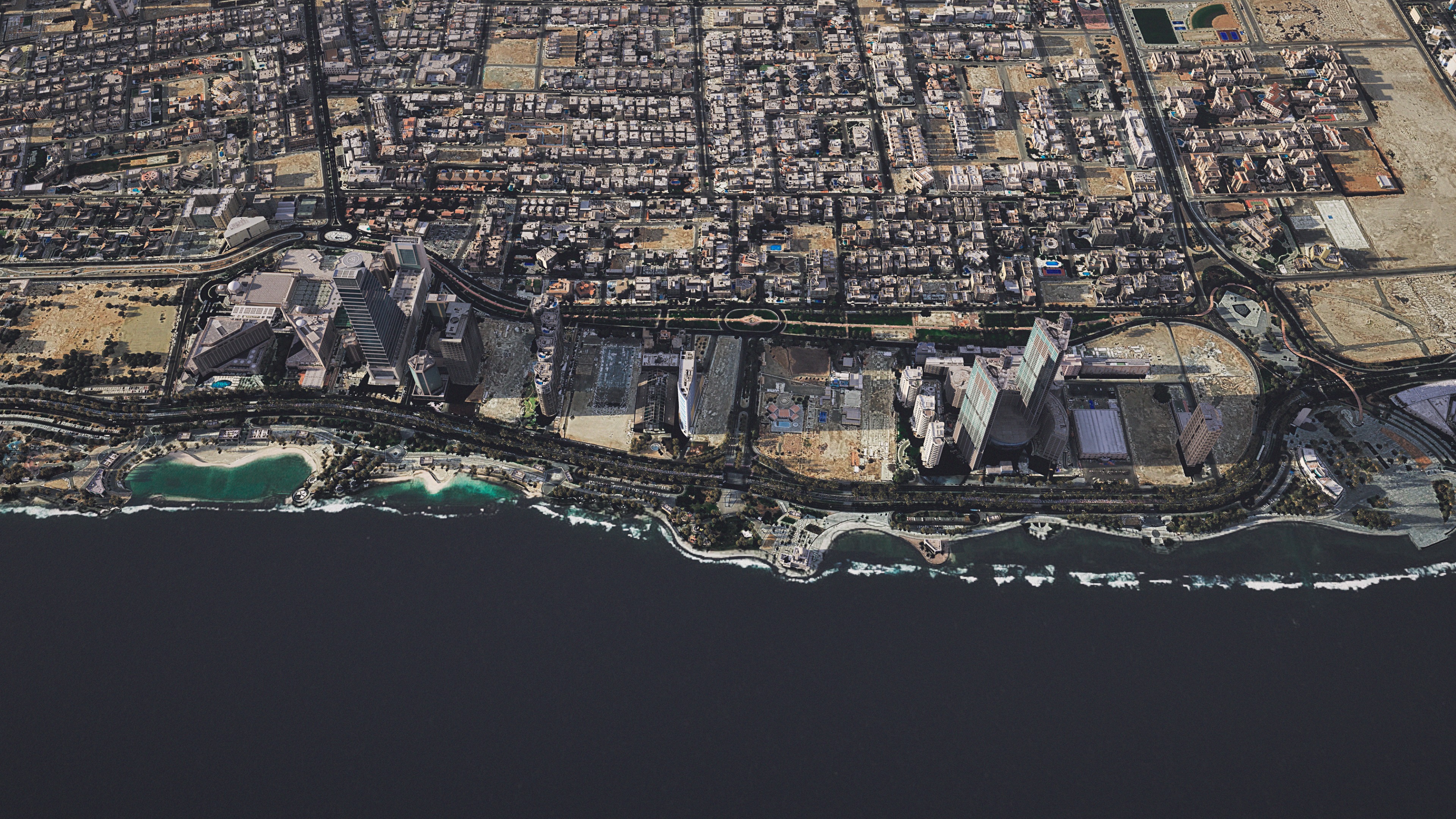 create a stunning aerial cityscape of a coastal metropolis during sunset use warm golden light casting long shadows over the city buildings adding a touch of orange and pink hues in the sky highlight the azure blue waters of the coastline with gentle white waves crashing onto the sandy beige shores pepper the city with lush green parks and leafy trees offering a vibrant contrast capture the architecture in shades of gray and beige accentuated by the glowing sunset the atmosphere should be serene yet vibrant showcasing a harmonious blend of urban life and nature
