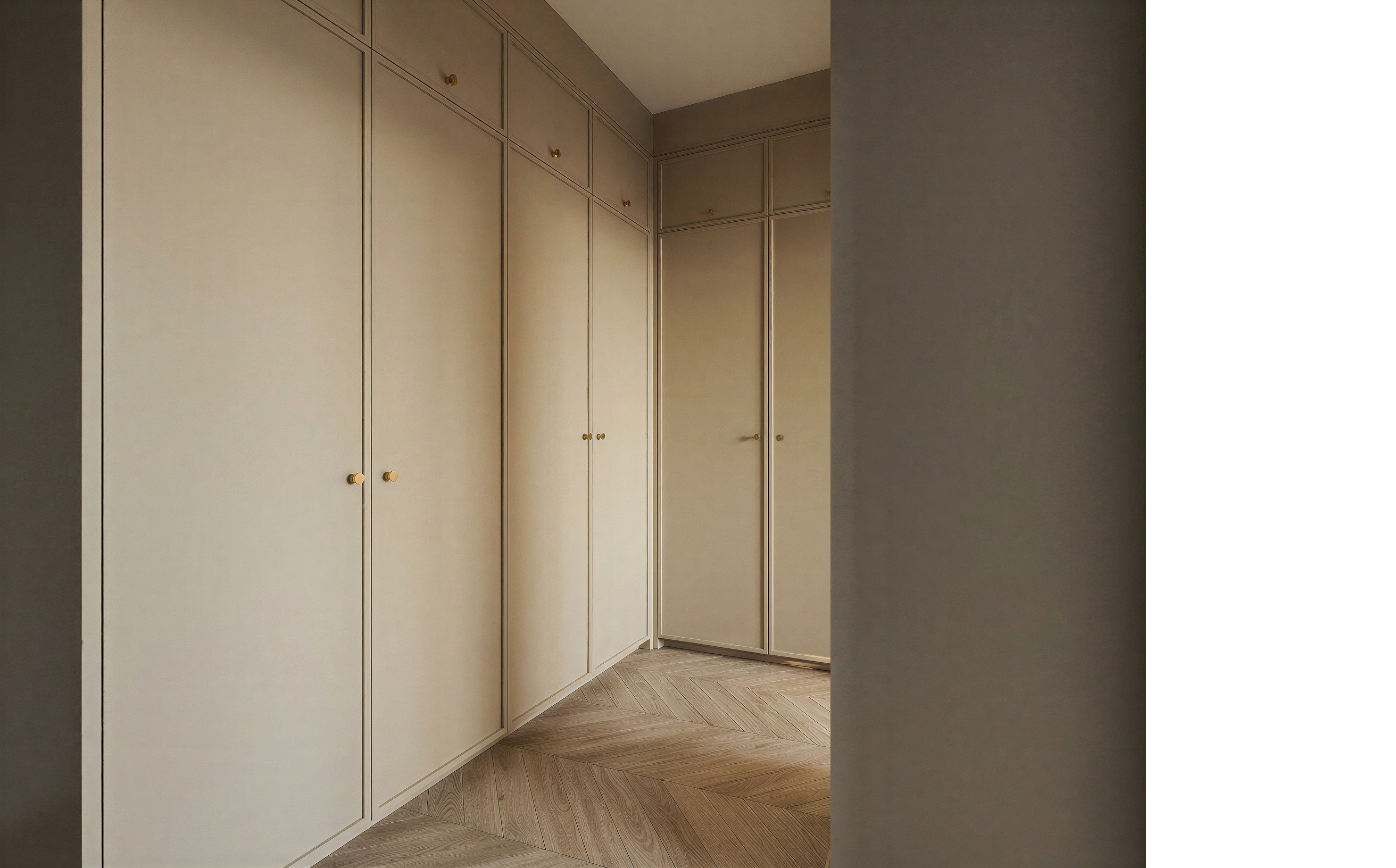 keep everything the same but open 2 cabinets so we see the inside shelves rod clothes hanging folded clothing led light under shelves