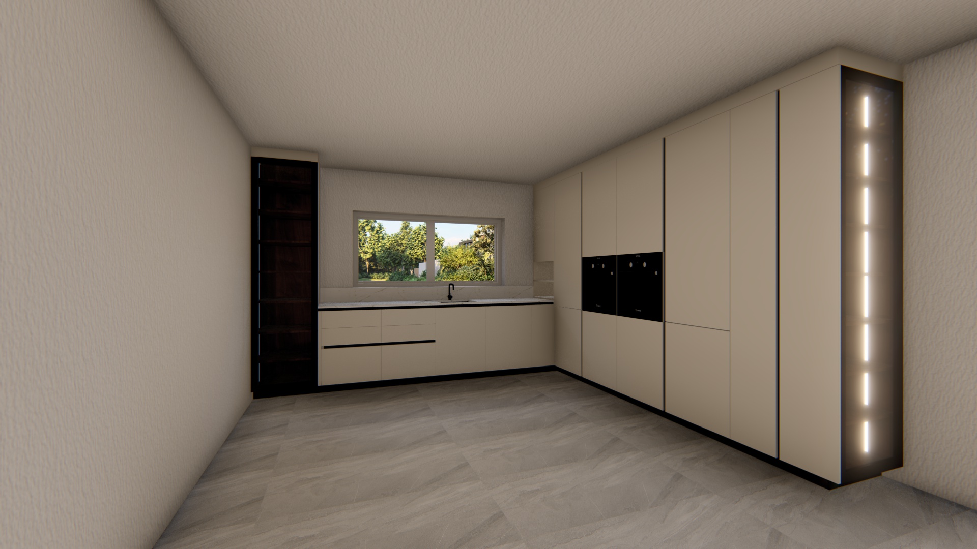 modern minimalist kitchen interior featuring sleek beige cabinets with a matte finish and dark brown accents on the cabinet edges and shelves the countertops are smooth pale marble with a black faucet adding contrast the window offers a view of lush greenery outside casting natural light into the room the walls and ceiling are a light cream color providing a soft warm ambiance the floor is covered with large light gray tiles enhancing the spaciousness the overall atmosphere is calm and inviting illuminated by subtle embedded lighting in the cabinets