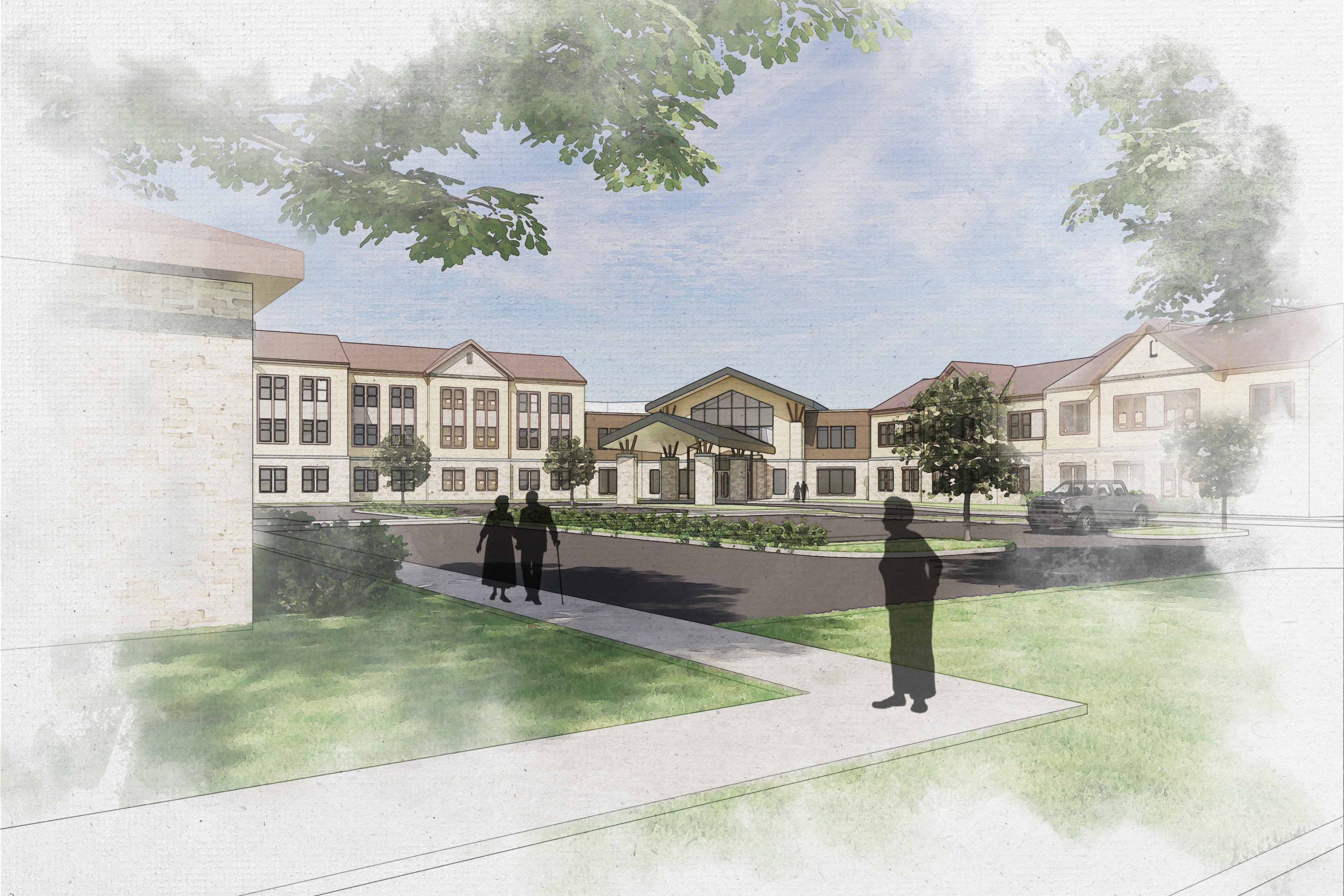 change the tone of the color above the first floor line move the foreground people close to the main building change the corner of the foreground building to wood siding with a stone base