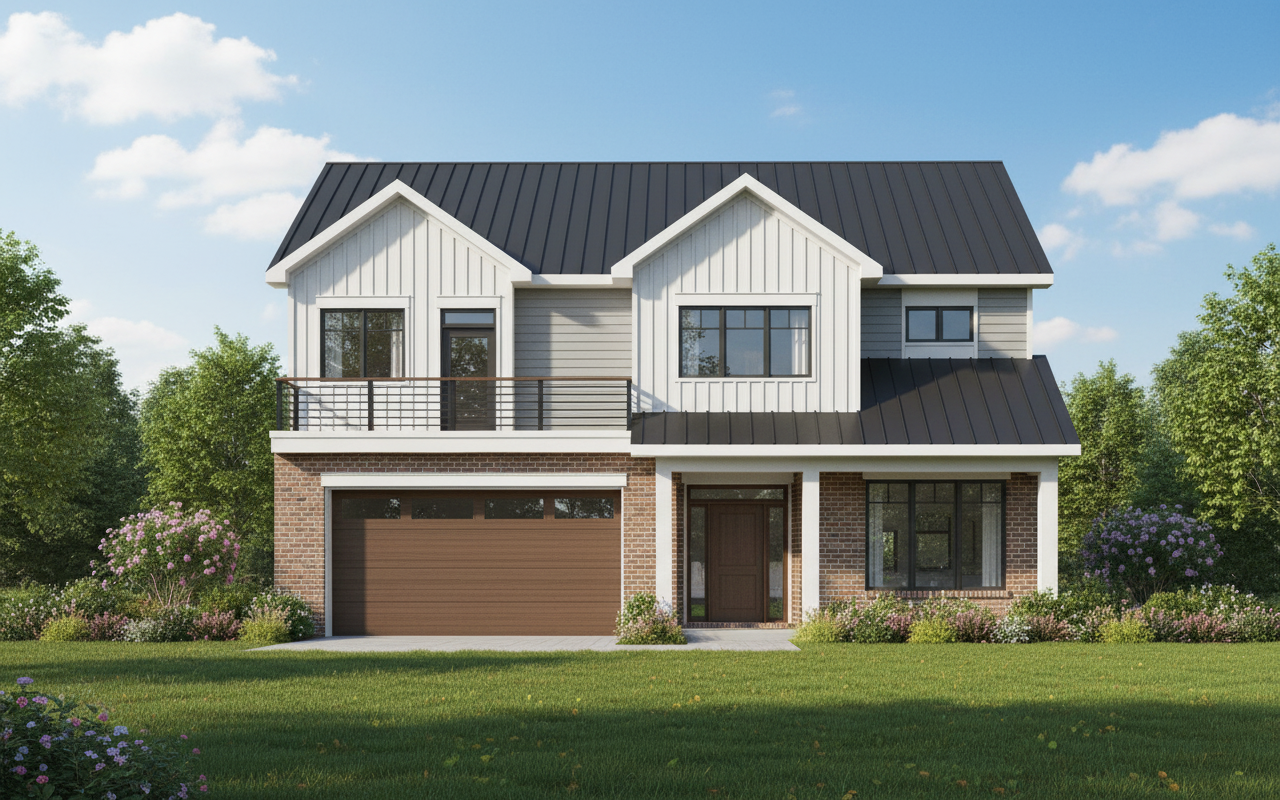 red brick black doors living room inside lighton trees in background and bushes in foreground