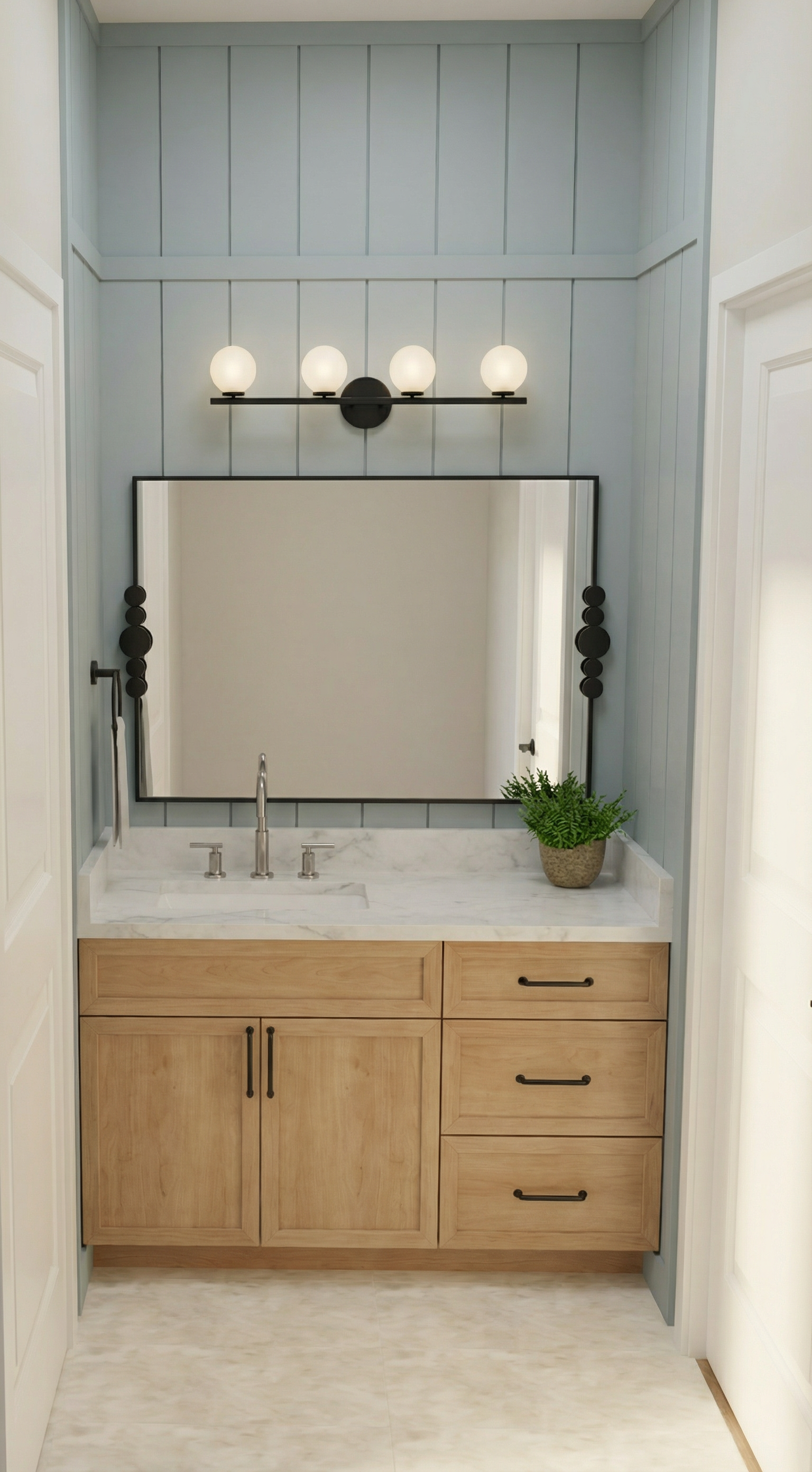 do not change anything or add anything a photorealistic high end interior render of a modern pilates studio matching the exact layout proportions and camera angle of the reference image do not change geometry or composition only enhance materials lighting and realism the flooring is warm natural oak in a herringbone pattern with rich grain variation subtle knots and a matte finish with soft reflections all walls and ceiling are finished in cream toned polished plaster with a smooth handcrafted texture subtle tonal variation and a warm cohesive appearance pilates equipment include pilates reformer machines in the same layout warm wood bases soft neutral upholstery beige taupe and refined metal detailing highly realistic materials with accurate proportions no visible branding or logos include wooden pilates chairs on the left side smooth warm wood finish with realistic grain and soft edges high end minimal appearance back wall arches maintain the large architectural arches on the back wall filled with antique bronze mirror panels subtle aged patina warm tone slightly imperfect reflections integrated warm led strip lighting within the arches to create a soft glow and depth right wall mini arches important along the right wall include small niche arches inside each niche place pilates equipment or accessories such as small props rings weights or compact pilates tools ensure items are properly scaled neatly arranged and consistent with the studio aesthetic the niches should feel intentional functional and styled not empty lighting soft warm diffused lighting throughout combination of subtle natural light and integrated led lighting warm glow within arches and along architectural edges no harsh shadows everything should feel calm and high end rendering quality ultra realistic materials pbr textures global illumination soft shadows ambient occlusion realistic reflections especially mirrors and metal subtle imperfections for realism clean geometry no distortion constraints keep consistency do not change layout or camera angle no branding on equipment maintain warm cohesive material palette
