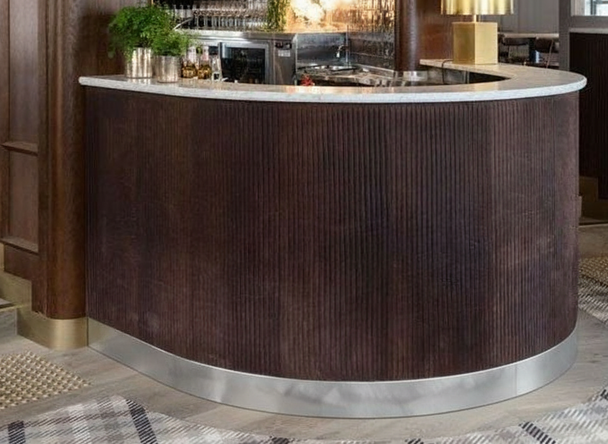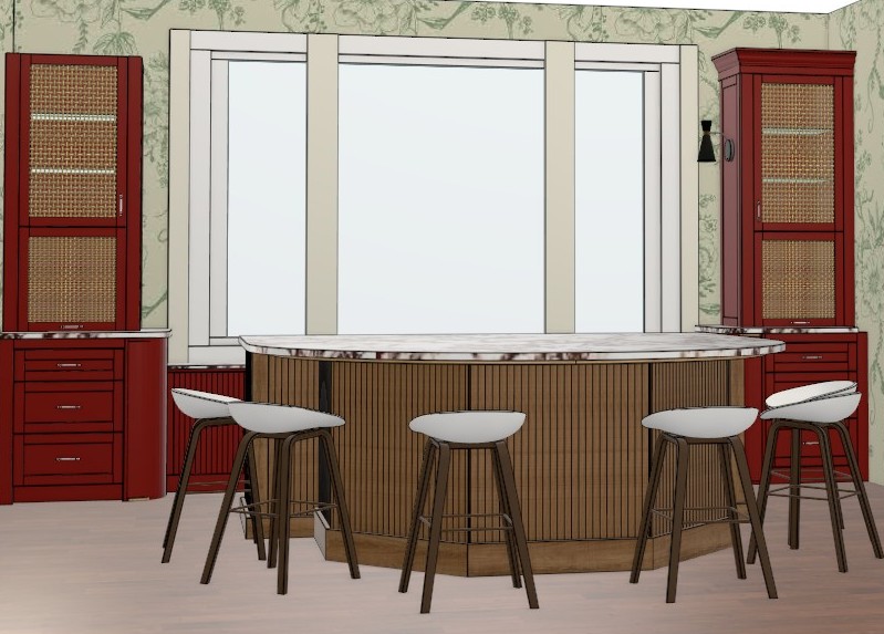 the island cabinets are stained rift cut white oak there is a brushed brass bar rail in front of the chairs the countertop is white with red veins the painted cabinets are dark red 20 sheen the window looks out onto bayshore blvd in tampa florida