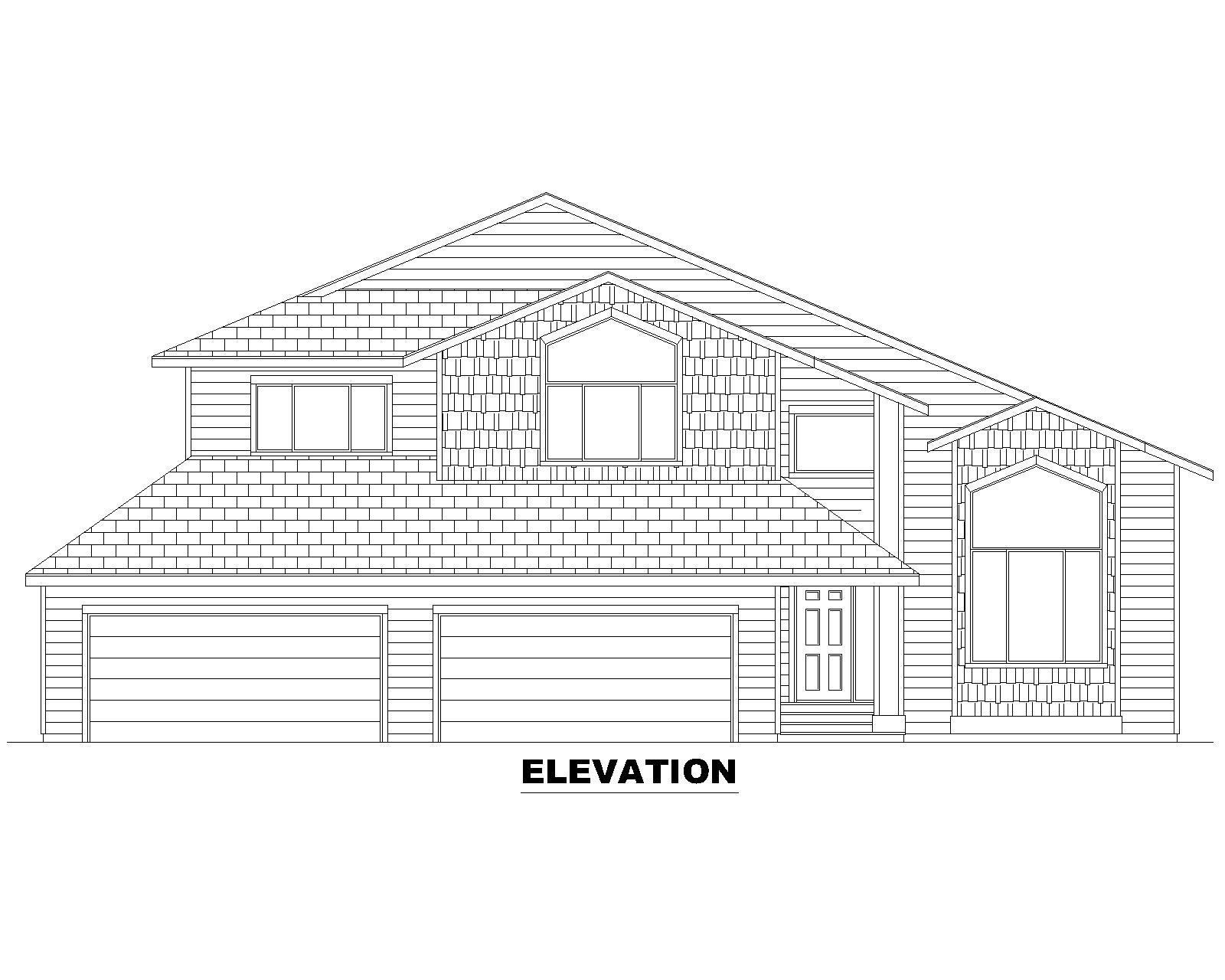watercolor render of modern home with red or dark brown paint with dark trim and stone accents include trees and an alaska like environment in the background simple driveway and walkways in front of the home