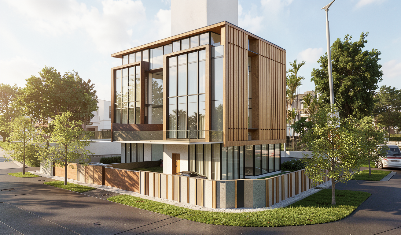 exterior shot keep everything the same in the main image but add the view outside the windows from the mood board