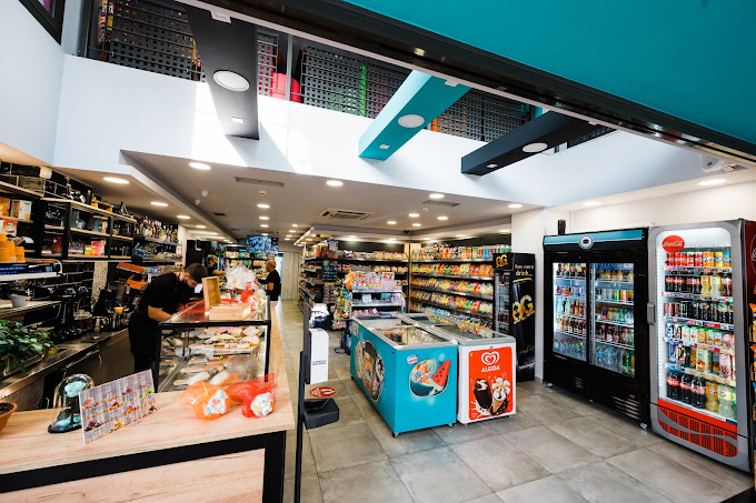 convenience store the store is filled with numerous refrigerators black colors and stone architecture