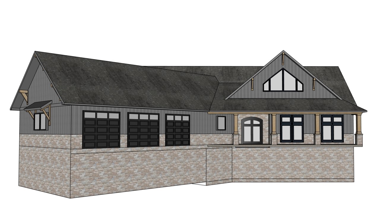 a modern house with a sloped roof and large windows the exterior features textured stonework in light beige tones complemented by sleek dark gray vertical siding the roof is a deep charcoal color contrasting elegantly with the facade the house has three prominent black garage doors and several large windows framed in matte black the atmosphere should feel welcoming and tranquil with soft ambient lighting suggesting a peaceful dusk setting the sky is a serene twilight blue casting a gentle glow over the house