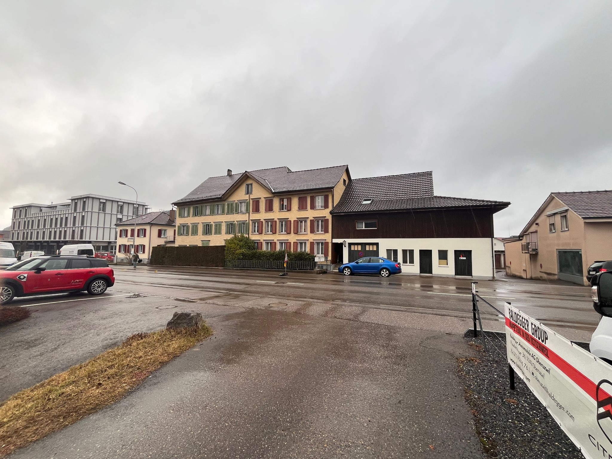 ersetze das haus mit einem modernen mehrfamilienhaus klinkerfassade in hellgrau drei etagen plus r ckversetzte attikaetage in der mitte ein tower aus dunkelgrauem granit und glas links wohnungen auf rechter seite einfahrt in die tiefgarage dar ber rechts ebenfalls wohnungen weiches nat rliches tageslicht leicht schr g einfallende sonne durch die fenster alle r ume hinter den fenstern k nstlich ausleuchten sanfte realistische schatten realistische materialien echte texturen hochwertige oberfl chenreflexionen blickrichtung ist nach s den sonnenlicht kommt von westen echte menschen echte autos pflanzen mit echten b umen und str uchern ersetzen sehr realistische umgebung belebte szene mit menschen gr sse der erwachsenen menschen etwa 1 80 meter und proportional zum haus nat rlicher himmel mit leichter bew lkung nat rliche farbwiedergabe leicht warme farbstimmung golden hour feeling das bild muss wie eine professionelle fotografie aussehen es soll ein echtes und reales foto sein canon eos r5 35 mm festbrennweite f 2 8 hyperrealistisch dslr qualit t raw aufnahme 8k aufl sung extrem scharf perfekte tiefensch rfe professionelle architekturfotografie