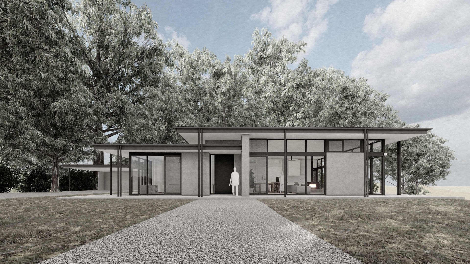 photorealistic architectural rendering of a contemporary australian rural home enhancing an existing lumion base image introduce soft atmospheric depth abundant natural light with a warm low angle sun early morning or late afternoon creating gentle highlights and soft shadows the front of the building needs direct sunlight on an oblique angle refine materiality to feel tactile and true to life concrete with natural texture and depth metal with subtle reflectivity and imperfections glazing with realistic reflections and slight interior transparencyadd understated warm interior lighting 2700k 3000k to create a soft glow from ensuring it feels natural and not overexposed balance interior and exterior lighting so neither dominates enhance landscaping with slight movement and realism softened edges and subtle tonal variation in grasses and foliage introduce light environmental effects e g faint haze diffused background to increase depth and atmosphere overall mood should be warm calm and evocative slightly ethereal but grounded in realism avoid overly dramatic contrast or stylisation aim for a premium architectural photography aesthetic with a cinematic softness replace the 2d figure with a woman
