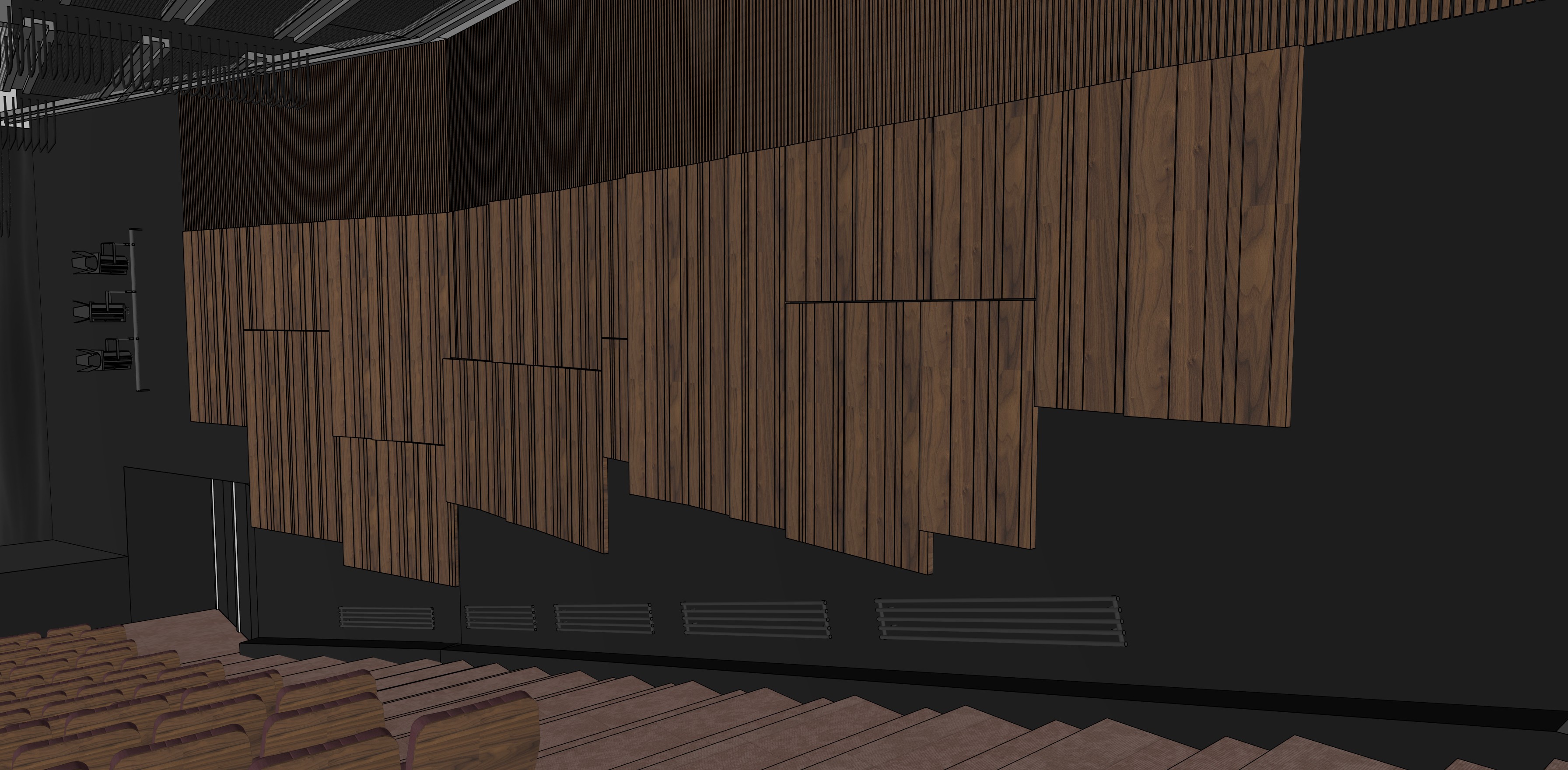 transform the provided theatre interior image into a high end photorealistic render with warm atmosphere soft glowing highlights and relaxed upscale coastal energy while keeping everything exactly the same same proportions same materials and same spatial configuration do not move or alter any objects geometry textures colors or furniture positions the chairs materials should read realistically the black wall is from acustic panels from reciclated materials carpet on the floor carpet on stairs wooden panels with carved lines a led light is hidden vertically in the slanted panels top strip made of thin wooden slats