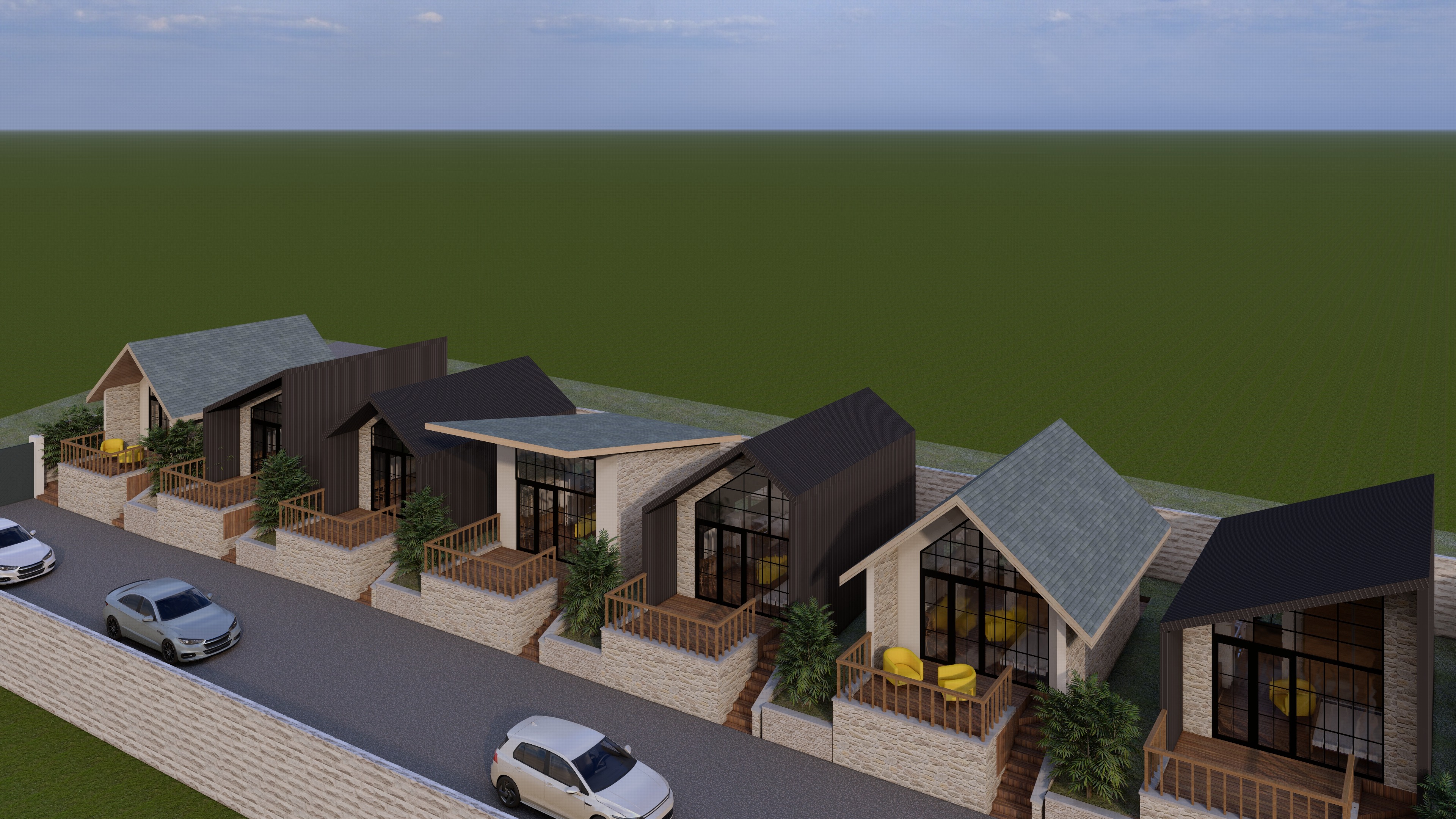 add few trees and vegetation proportional height to buildings behind to give it context add interior warm lighting and evenly spaced wall sconce only 2 wall sconce for every unit of equall height from from ground as well