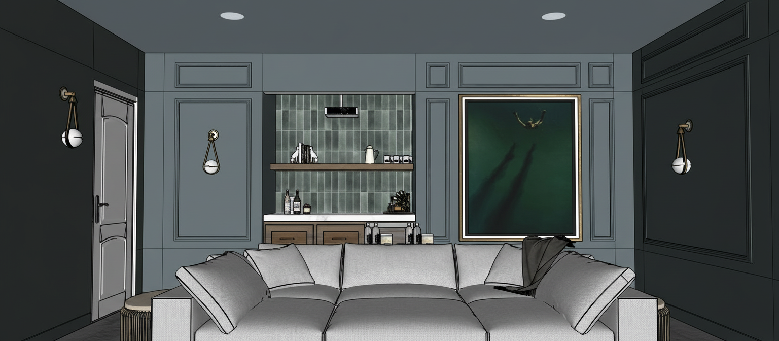absolute priority rule the scene must remain 100 identical to the reference image any modification addition removal reinterpretation or adjustment is strictly forbidden except the explicitly defined changes below do not change geometry layout objects or composition do not add any objects decorations flowers plants or details of any kind no creative interpretation is allowed allowed adjustments strict wallpaper color adjust to earthy beige with warmer brown undertone subtle elegant not dark ceiling soffit behavior critical split a main walls corner ceiling remains flat in one continuous plane maintain 15 cm recessed gap from wall integrated led strip inside gap soft indirect wall washing light b wall with entrance door suspended ceiling must fully connect to the wall no gap no led strip on this wall clean architectural termination curtain lighting new detail led strip above curtain emits soft light turquoise color very subtle intensity creates gentle colored glow on sheer curtain no color spill into the rest of the room keep scene neutral materials locked micro polish light wooden floor with beige rug 2 cm cut pile add subtle fiber detail micro roughness variation coffee table walnut base marble top soft reflection breakup on marble cabinets walnut white semi gloss laminate reduce highlight intensity no clipping walls earthy beige vinyl wallpaper textile texture acoustic panels walnut slats on black background emphasize depth in gaps sofa grey fabric slightly stronger shadow definition in folds lamp black matte shade all objects must remain exactly as in reference lighting final balanced setup primary light daylight from windows behind camera soft frontal illumination clean even exposure natural gradient into depth led systems main ceiling gap warm neutral indirect light curtain led soft turquoise accent very subtle door wall no led no harsh shadows neutral base color temperature global illumination physically correct gi soft contact shadows natural bounce light ambient occlusion especially slats corners balanced exposure ultra realism final 2 polish micro detail walnut grain depth marble micro roughness textile fibers sofa rug slight film grain 1 1 5 subtle microcontrast boost soft highlight roll off additional polish reduce cgi smoothness enhance material separation maintain soft but readable depth shadow depth soft contact shadows slight depth boost via ao no flat rendering clear spatial layering reflection control no perfect reflections marble diffused laminate controlled semi gloss ceramic matte exposure color no burned whites preserve detail neutral grading only exception subtle turquoise curtain glow camera original camera unchanged eye level 35mm equivalent output 8k resolution photorealistic luxury client presentation final lock final rule the output must be a photorealistic version of the exact same scene not a redesigned or modified version only the explicitly defined adjustments are allowed everything else must remain unchanged