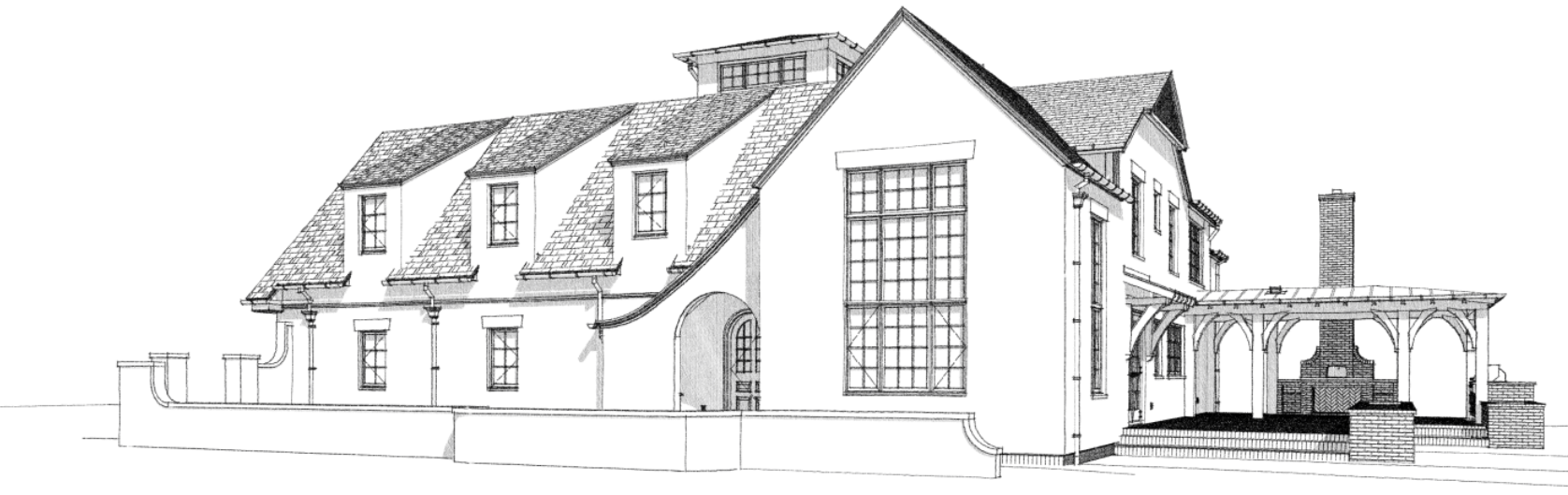 transform this sketch into arendering stucco exterior cedar shake roofing copper guttters and downspouts black grid windows overcast pnw day