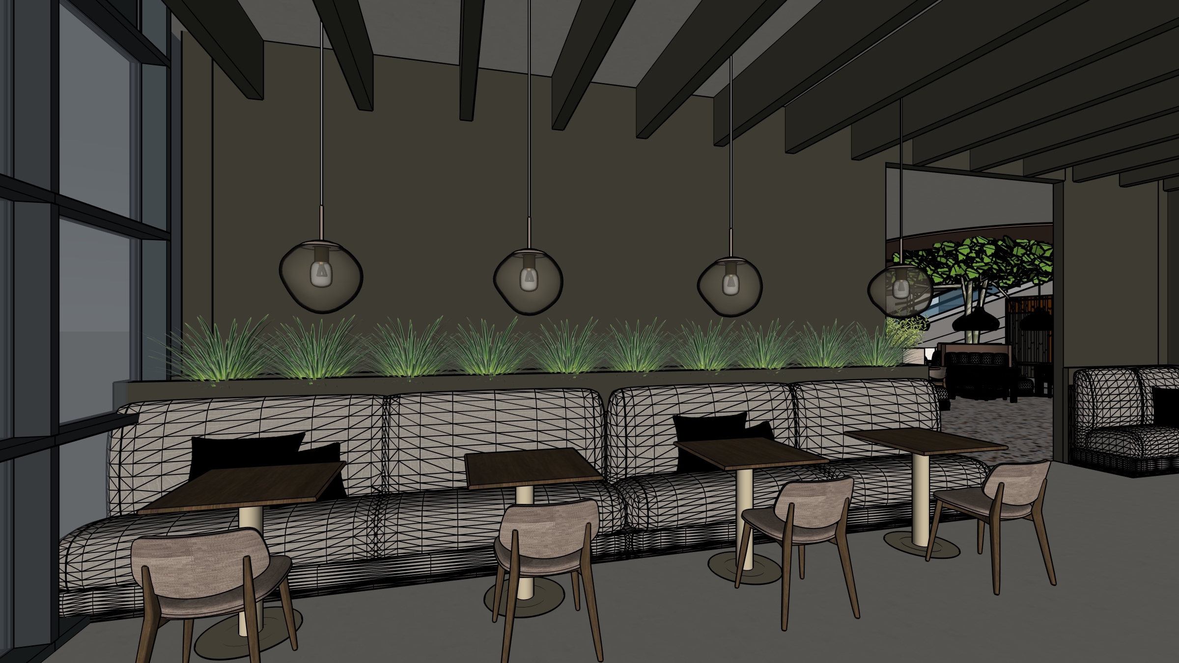 a photorealistic 8k high resolution interior photograph captured in natural bright daylight based strictly on the current perspective and composition the perspective is maintained with natural daylight flooding in from the left grid glass partition creating a clean crisp and fresh daytime atmosphere sophisticated layered architectural lighting is soft and complementary there are absolutely no changes allowed to the design or proportions of the original wireframe structure flooring the floor on the immediate foreground in the main lounge area before the doorway is a smooth clean gepolijst beton in a neutral gray tone the floor behind the doorway within the beyond area viewed through the doorkijkruimte features a detailed patterned terrazzo surface with black white brown and pink stone fragments embedded in a pale creamy matrix columns walls structure main walls finished in a smooth matte coat of little greene attic 2 dark charcoal green but appearing distinctly brightened by daylight structural columns all columns are also finished in little greene attic 2 ceiling beams the exposed beams and the rest of the ceiling are also finished in little greene attic 2 glass partition left the large gridded glass partition is clear providing the main light source background vista the view through the open doorway on the right reveals the beyond area with the central tree complex seating and the detailed terrazzo floor all rendered in the same bright daylight style furniture seating long booth the long contiguous straight bench is upholstered in full grain light grey leather dux vintage fr light grey with a clean smooth distinct leather finish leather texture definition must be sharply detailed not dark distressed or fabric with clearly recognizable segmentation and seams two black pillows remain tables and chairs four chairs with walnut frames are upholstered in smooth neutral taupe wool felt canyon 0967 0025 taupe they are placed at four small walnut topped tables on pedestal bases exactly as positioned built in elements the integrated planter box directly behind the bench is covered in a textile look wood laminate decolegno alpaca fd32 in a clear camel beige tone it is filled with feathery grasses clearly visible in daylight lighting the pendant light locations are rendered as realistic rookglas smoke glass pendant lamps suspended by bronze rods these lamps show a warm glowing light source within the translucent glass with subtle reflections refinement focus on accurate daylight interaction sharp texture definition for all materials leather felt wood grain concrete smoke glass terrazzo accurate light behavior and realistic reflections natural daylight from the left must be dominant strict directive render the scene exactly as shown in the wireframe of the visual preserving all proportions and design elements but with a bright daytime atmosphere and photorealistic materiality and lighting omit all plants except the grasses