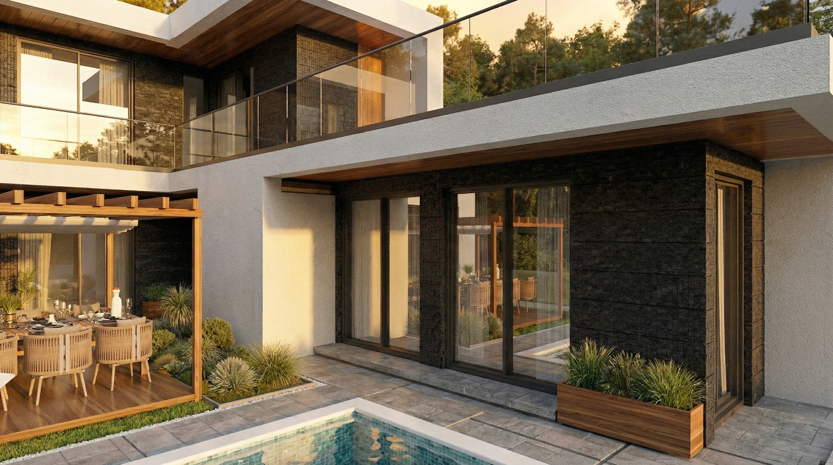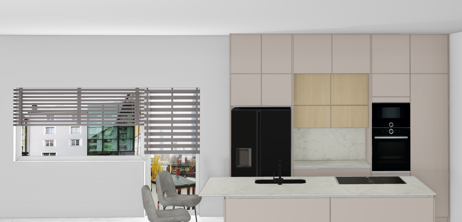 create a modern minimalist kitchen interior with a light and airy atmosphere use soft sahara beige tones for the cabinetry contrasted by a sleek black refrigerator and built in appliances the kitchen island should be a light sahara beige color with a black faucet include two elegant light grey bar stools with black metal frames the floor is light natural oak design the walls to be a crisp white enhancing the bright and open feel allow natural light to stream through the large windows with horizontal grey blinds casting gentle shadows the view outside shows a quaint urban landscape adding warmth and vibrancy to the scene