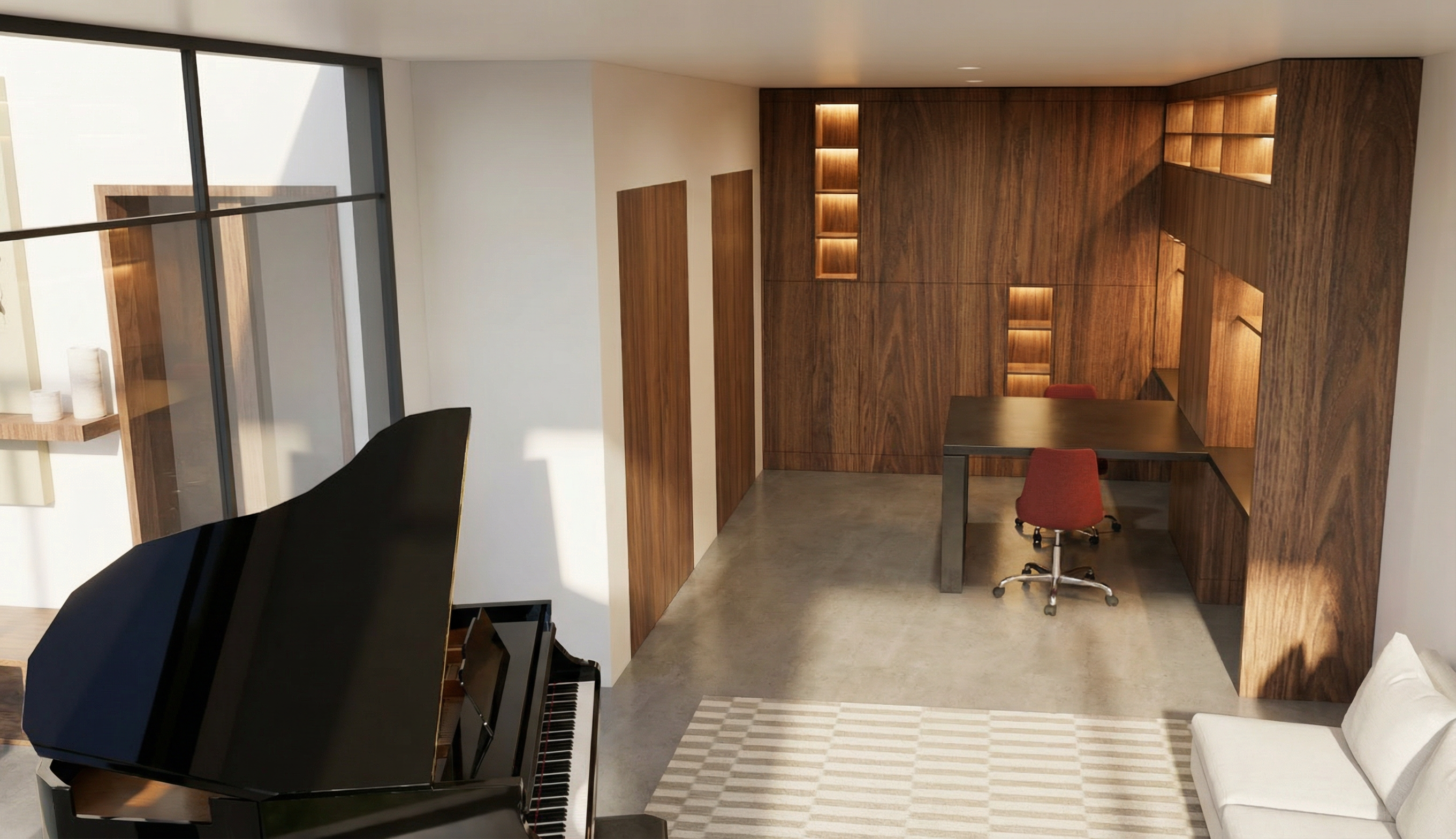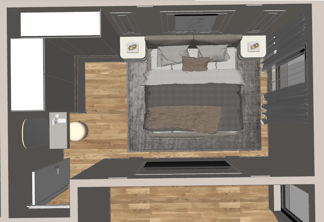 make render like the sketch is light warm soft cozy space ad more light pouf is orange color drawing above the bed is same like on sketch