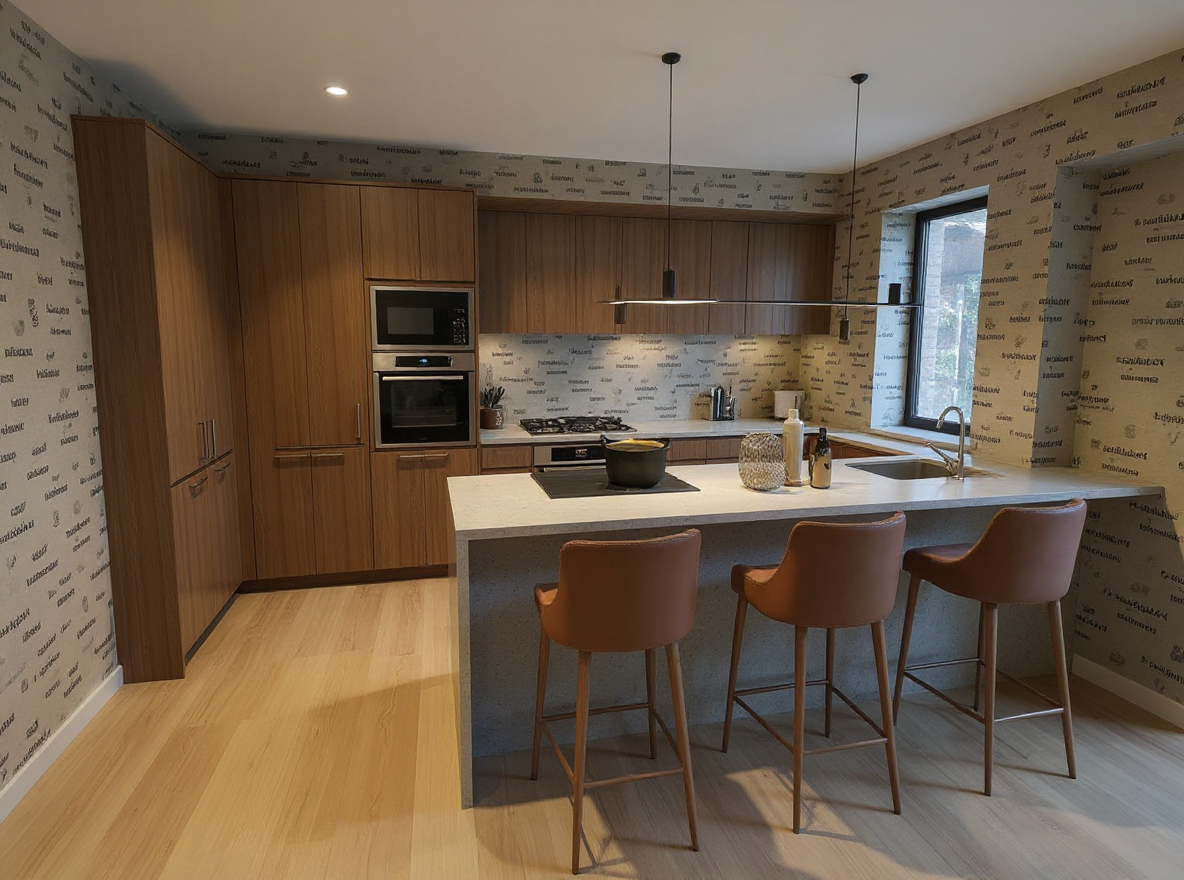kitchen with units floor to ceiling in light walnut peninsular in cement finish remove celing lights window leads to a smalllaundry room but you can only see the window