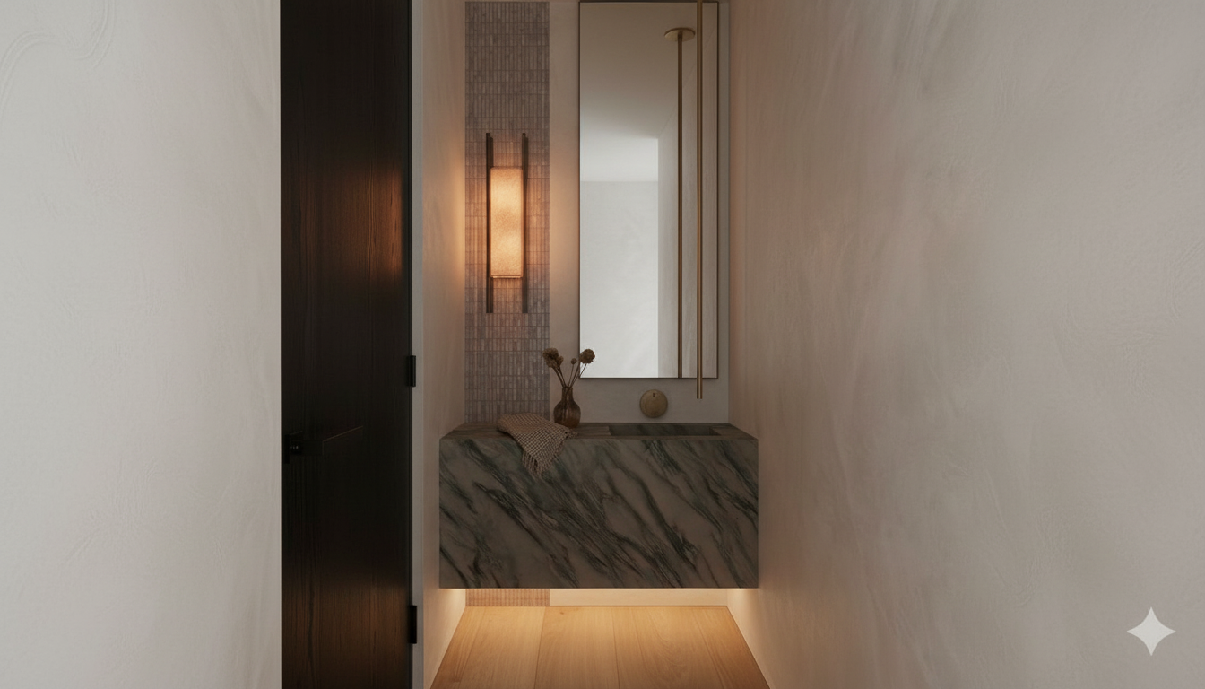 a high end architectural digest style interior photograph of a luxury powder room with a quiet luxury aesthetic shot on a 28mm full frame lens at eye level with subtle asymmetrical composition and natural architectural framing the lighting is a balanced layered architectural lighting scheme with soft contrast and realistic depth primary light source is a warm wall sconce on the left 2700k casting soft directional light across the bianco antico vertical tile wall the light creates gentle shadow falloff and visible texture grazing but not harsh darkness a very subtle ambient fill light is introduced through indirect ceiling bounce neutral warm white extremely low intensity ensuring the space remains readable and not overly dark this fill light does not flatten the scene but softly lifts shadows in deeper areas secondary under vanity lighting soft warm 2400 2700k led glow provides a gentle horizontal base glow that lightly illuminates the floor and adds depth under the floating vanity without overpowering the scene the right side of the room retains soft natural shadow but with visible detail preserved in all materials no crushed blacks shadow areas remain readable with subtle bounce light from the plaster walls the green oasis marble vanity is well balanced between light and shadow allowing the emerald veining to remain clearly visible with soft specular highlights and natural depth the borderless vertical mirror reflects a controlled mix of soft ambient light and partial shadow realistic not overexposed not overly dark aged bronze fixtures ceiling mounted faucet and wall control knob catch subtle highlight edges without disappearing into shadow portola roman clay walls act as a soft light diffuser gently reflecting and bouncing light back into the space preventing harsh darkness while maintaining texture and material realism wide plank white oak flooring reflects minimal but visible ambient light adding warmth and grounding the composition lighting direction is natural layered and physically based soft key from sconce subtle fill from ambient bounce and minimal accent glow from under vanity lighting no flat studio lighting no overexposure no crushed blacks and no harsh spotlighting ultra realistic v ray corona renderer aesthetic global illumination physically based rendering soft natural contrast and architectural digest editorial photography style 8k resolution slight imperfections in light spread and material response for realism