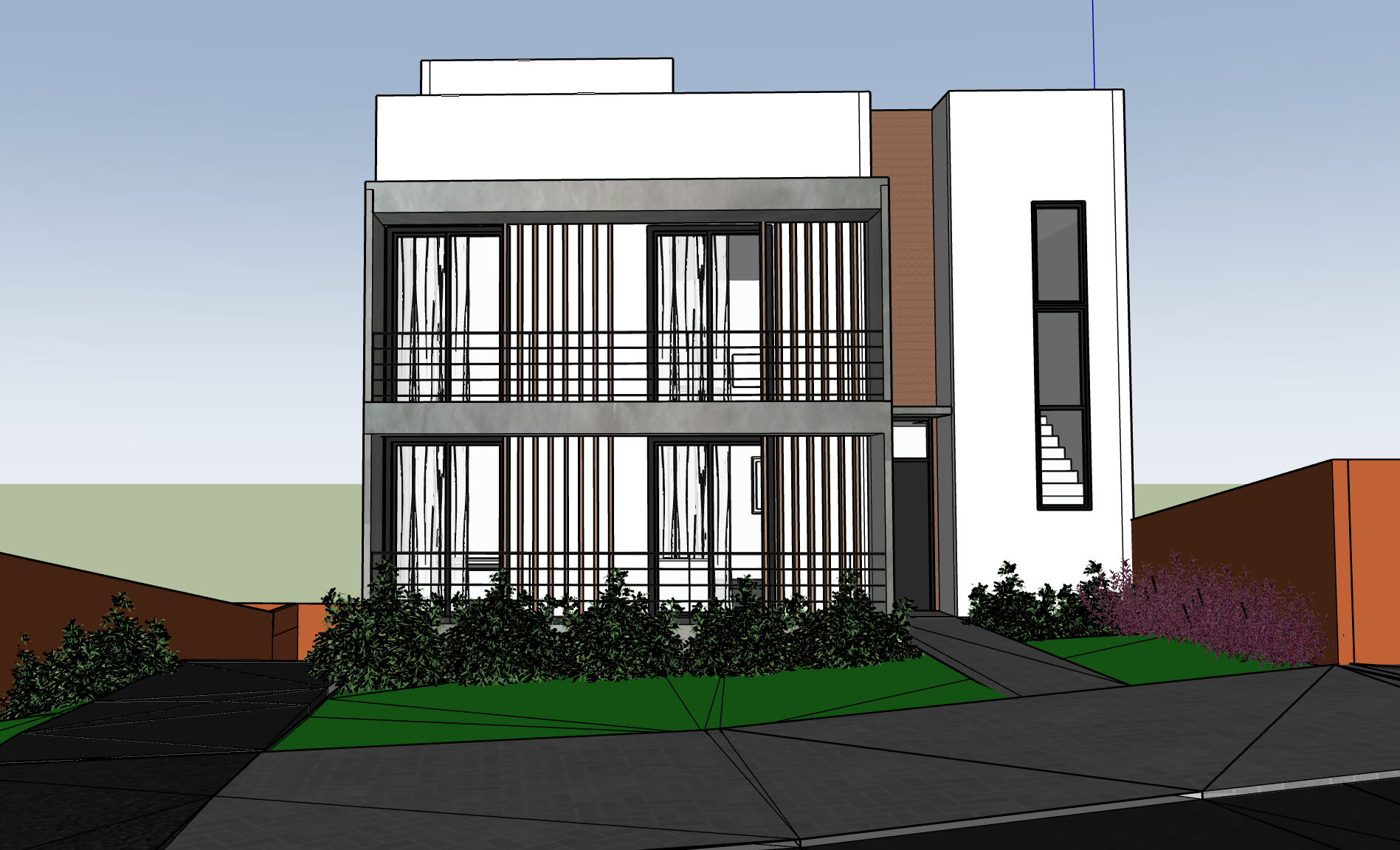 create a photorealistic rendering of this facade exactly as it appears in the original image don t alter any part of the existing project keep the facade design gate vegetation wall shadows and materials exactly as they are crie uma renderiza o fotorrealista desta fachada exatamente como aparece na imagem original n o altere nenhuma parte do projeto existente mantenha o design da fachada port o vegeta es muro sombras e materiais exatamente como est o apenas adicione o contexto realista da vizinhan a um gramado na frente da casa com cerca de 7 metros uma cal ada em frente uma rua asfaltada entorno com arvores e uma casa vizinha moderna esquerda ou direita e um c u azul com algumas nuvens dispersas mantenha a ilumina o e a perspectiva coerentes com a imagem original