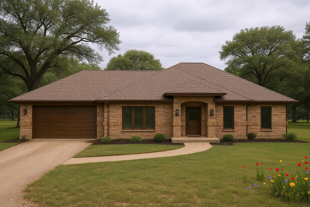 prairie style texas ranch land setting with foundation planting and wildflowers mottled brown roman brick bronze paint on doors windows fascia texas live cream colored window frames oak trees in yard taper walk up to front porch gravel drive to garage door no wall light by garage door texas red blue and yellow wild flowers in yard ramp sidewalk up to front porch ledge at base of house is concrete add wall light to right of garage door