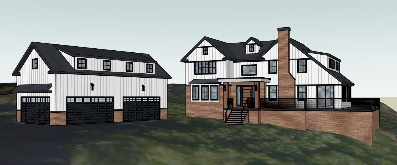 render with a contemporary design dark slate roof modern light color board and batten siding natural brick at the base modern farmhouse style warm sunny day with some trees in the distance