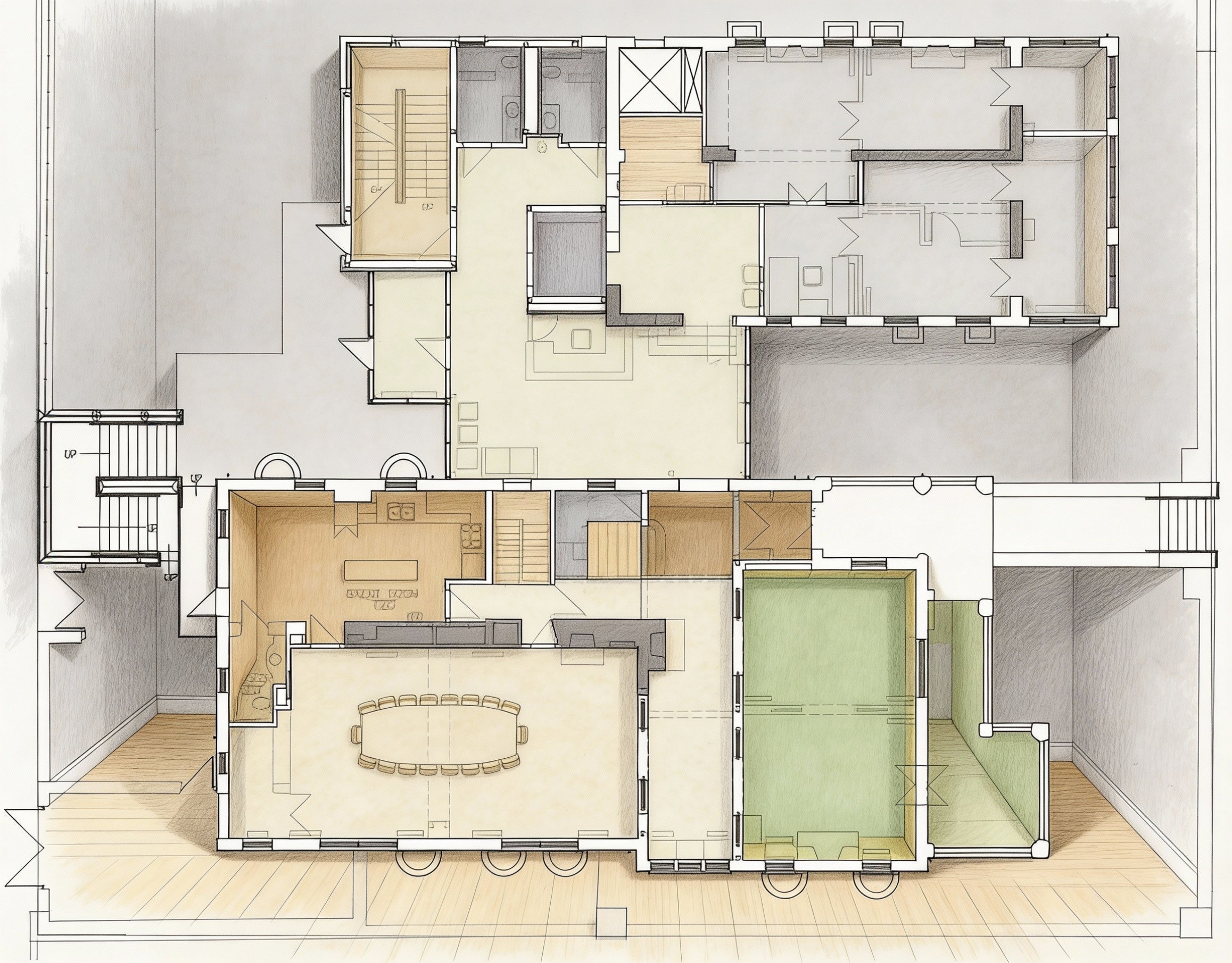 historic hotel floor plan illustration in plan view clean minimal and diagrammatic with soft hand drawn line quality and subtle sketch texture clearly distinguish suites lobbies bars restaurants clubs stairwells and corridors with restrained line weights and hierarchy calm muted warm color palette emphasizing neutral floors soft wood tones and gentle accent colors for furniture and feature areas professional quiet competition ready and visually legible evoking a historic yet contemporary presentation drawing without photorealism or perspective distortion keep the image 2d and remove all furniture linework and labels poche all walls gray and make the background flat with only shadow