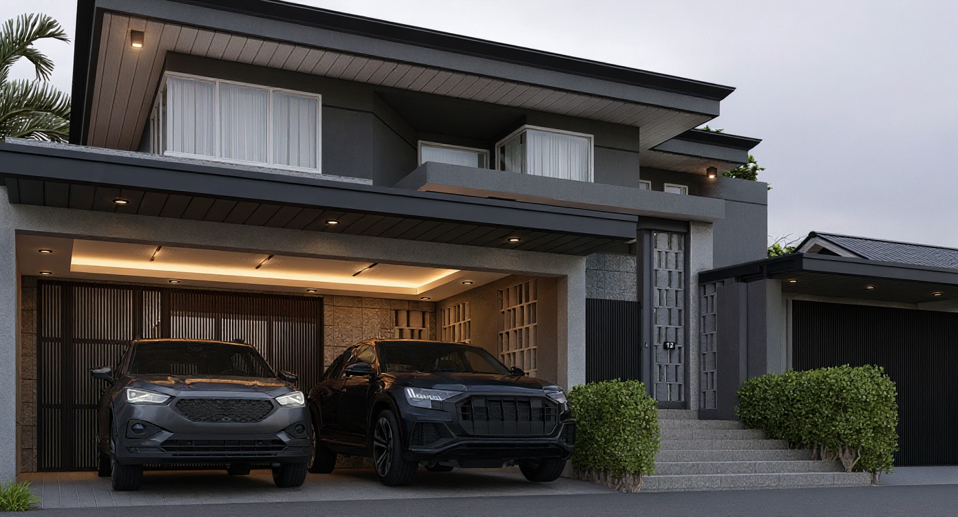 modern two story house with a minimalist design featuring large glass windows and crisp white walls the lush green lawn covers the foreground with tall trees in the background a bright blue sky with light fluffy clouds add vibrant red flowers on the left with additional potted plants near the house the atmosphere is serene and inviting with a focus on natural light and calmness using contrasting elements to enhance the architectural details ensure you maintain the angk le of the picture as it is no changes on the angles please
