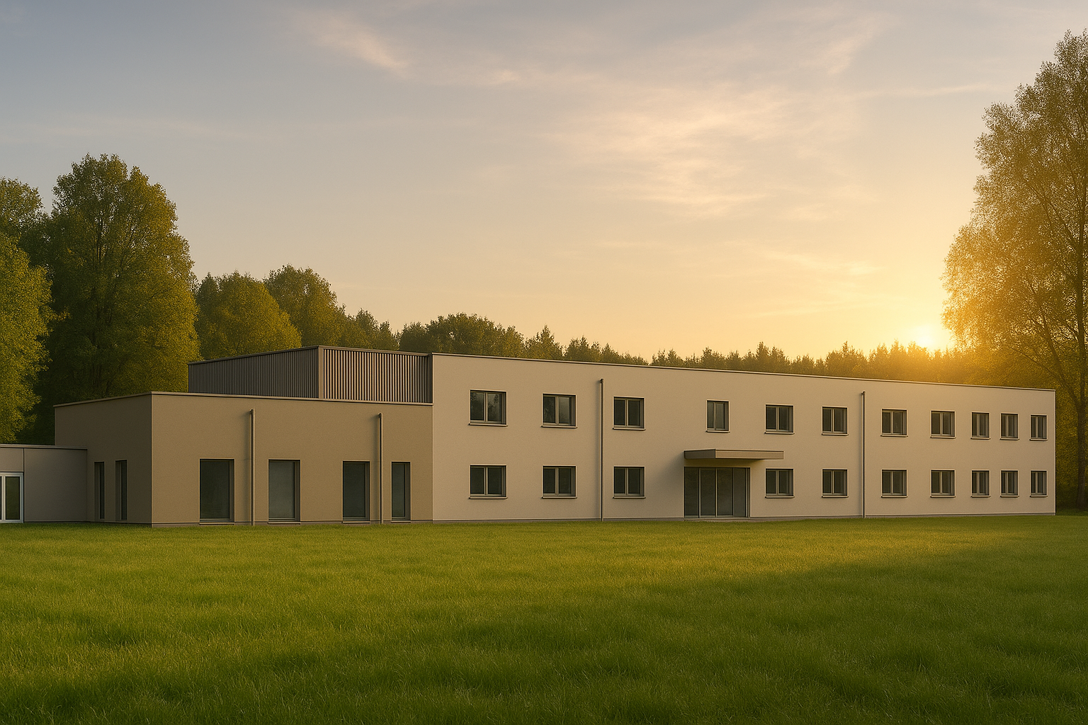 erstelle mir ein fotorealistisches bild mit den exakten farben aus der vorlage die ansichtsseite ist die zufahrtsseite daher wird hier auch eine zufahrt eingeplant die zufahrt soll wie eine hotelzufahrt sein asphaltiert parkpl tze parkende autos gehfl chen blumen