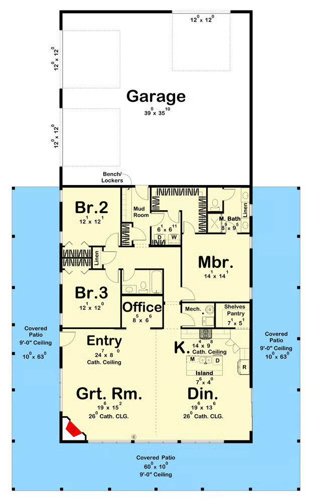 this is a barndominium plan the garage is a concrete floor and the rest of the house is a residence simplify the floorplan for marketing no trees or bushes just furniture such as beds in the bedrooms and living room furniture in the living room with cabinetry in the kitchen