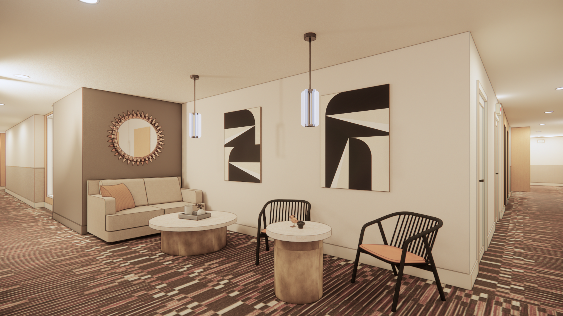 add no natural light this is a corridor with no windows avoid cinematic lighting avoid golden hour avoid strong directional sun rays