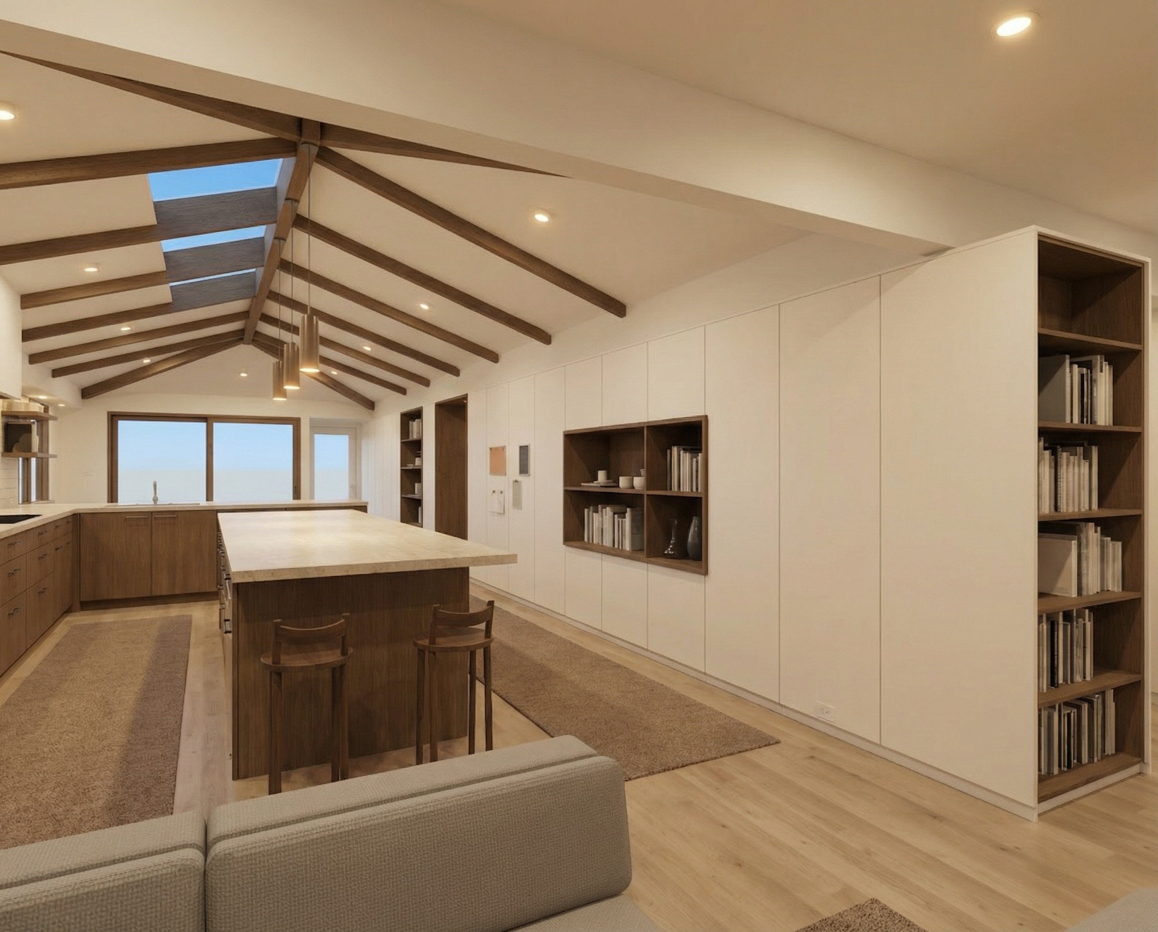 the white panels along the right side of the image should slightly contrast the white walls and drywall add warm lighting glow to the shelves without showing the source of the light eliminate the rug on the left side of the island