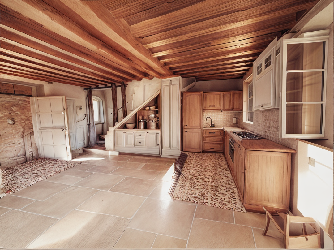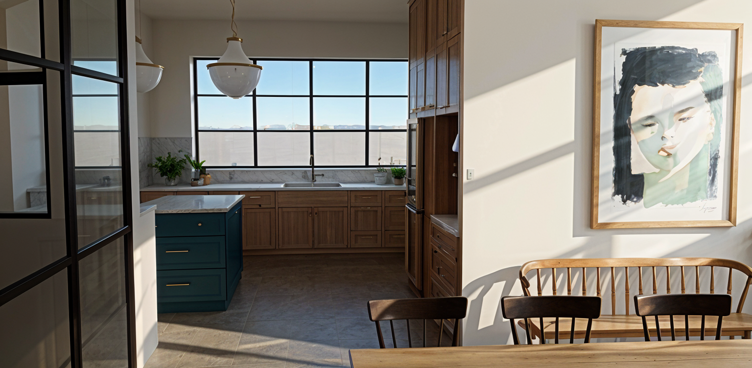 please make the picture have a pleasant scandinavian atmosphere the wall is the color of rosemary branches the dining table is round and white the 4 dining chairs are medium beige with white legs behind the dining table the floorboard runs up the wall which is a natural oak color on the right edge the back of the stand is not completely covered you can see through it from below and above the round carpet is a bluish shade and there is also a soft beige shade on the window in front of the curtain through the window we can see a green landscape light comes from the left side too